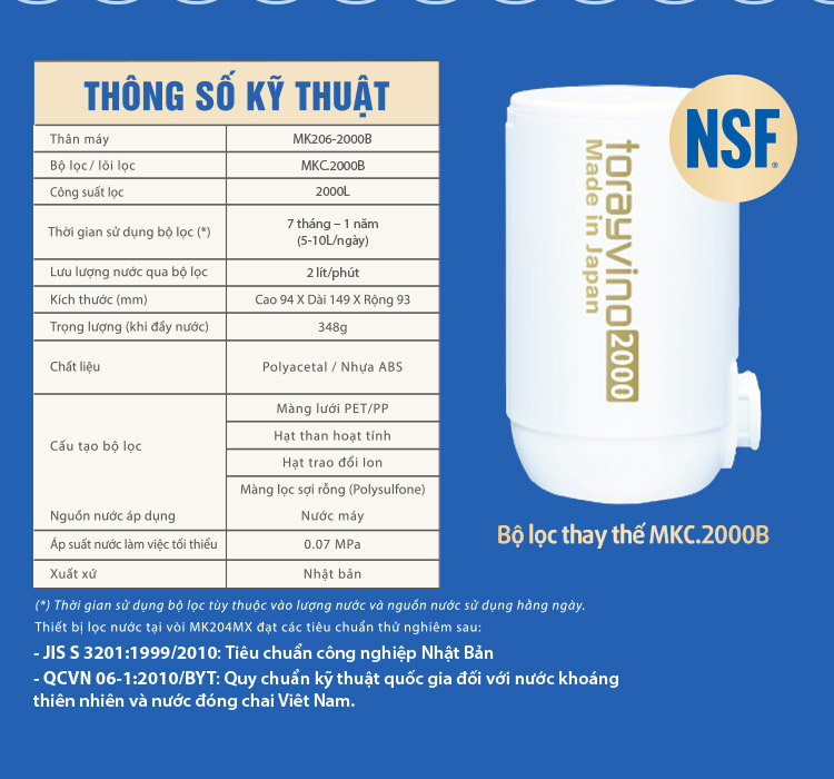 Mua tại TiktokLõi Lọc Thay Thế Torayvino MKC.2000B là lõi lọc nước mới nhất đến từ Nhật Bản cho các dòng thiết bị lọc nước tại vòi Torayvino với công suất lên đến 2000L, loại bỏ 13 tạp chất và 99,99% vi khuẩn có hại trong nước máy nhưng vẫn giữ nguyên được khoáng chất cần thiết cho nhu cầu uống trực tiếp và sử dụng nước sạch hàng ngày của gia đình. Vì sao nên sử dụng máy lọc nước đến từ Nhật Bản Torayvino Đặc điểm của bộ lọc nước thay thế Torayvino MKC.2000B: