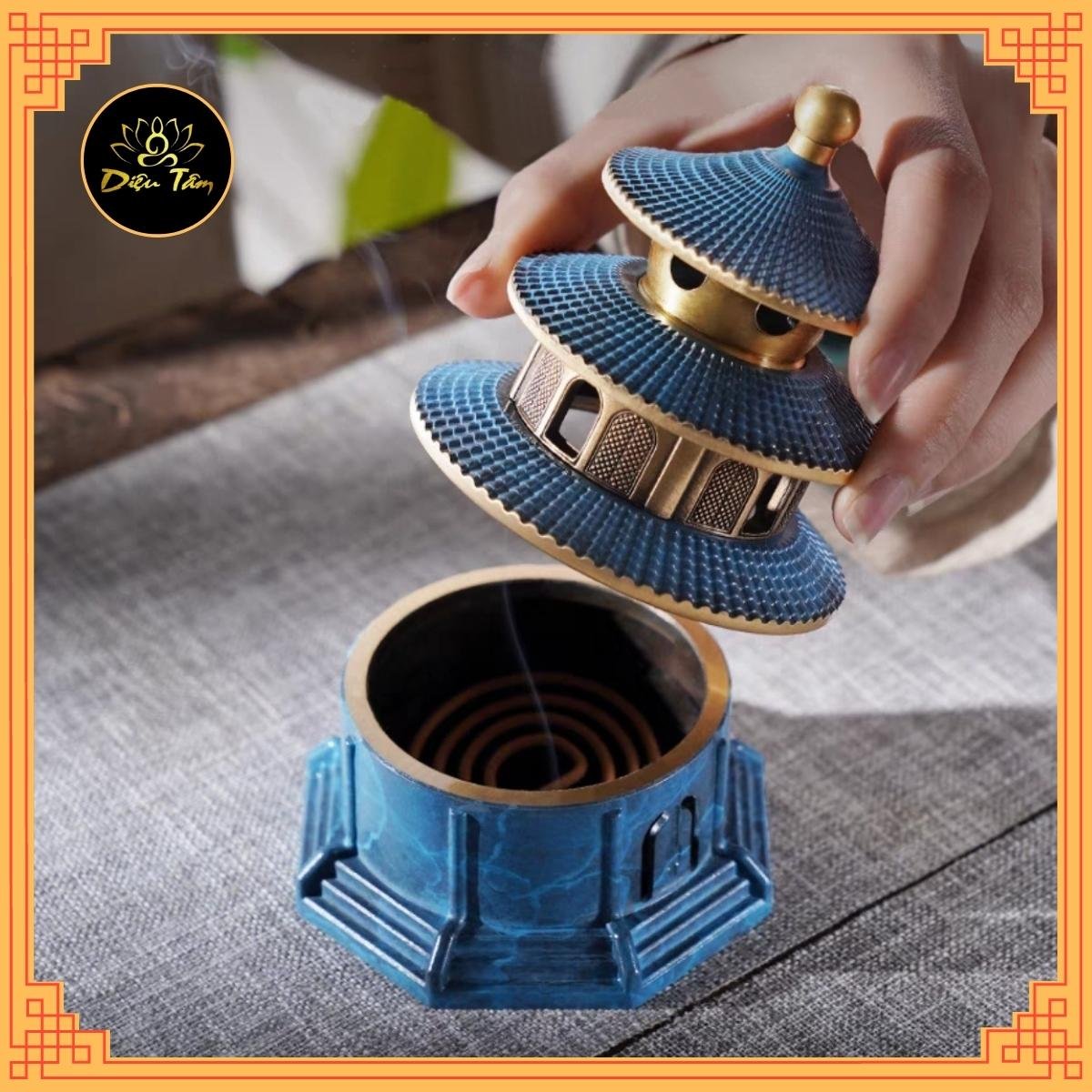 ✨Lư xông trầm đồ thờ cúng bằng đồng hình bảo tháp sơn xanh phụ kiện trang trí ban thờ, bàn làm việc