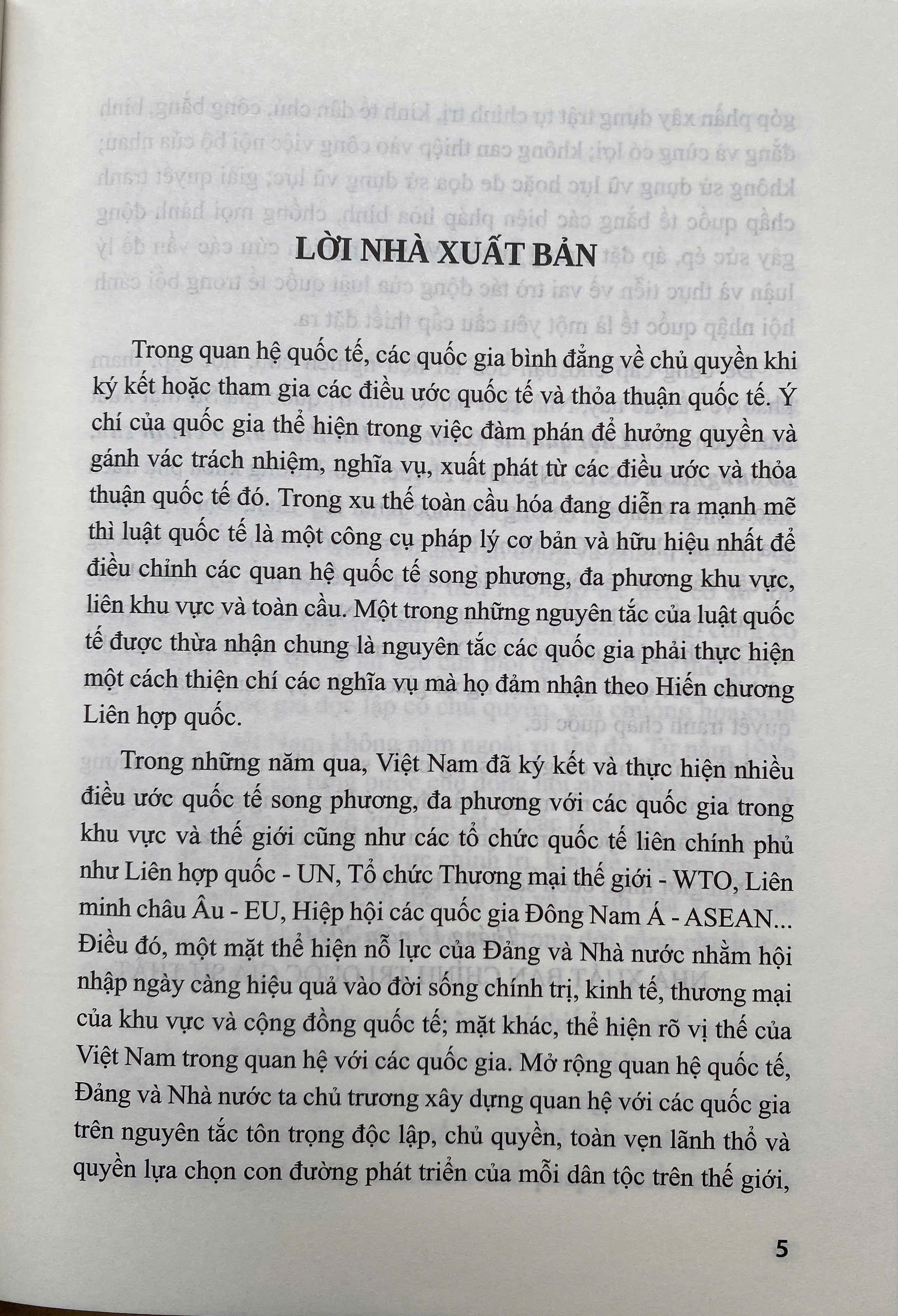 Trong bối cảnh quốc tế ngày nay, không một quốc gia nào có thể tồn tại, phát triển một cách độc lập và bền vững nếu không tham gia vào các quan hệ quốc tế từ bình diện khu vực, liên khu vực toàn cầu. Do vậy, liên kết, hợp tác trên cơ sở tôn trọng độc lập, chủ quyền, toàn vẹn lãnh thổ, bình đẳng, cùng có lợi là nhu cầu và xu thế tất yếu của mọi quốc gia trên thế giới. Là một quốc gia độc lập có chủ quyền, yêu chuộng hoà bình và công lý, Việt Nam không nằm ngoài xu thế đó. Từ năm 1986 đến nay, nước ta đã từng bước chủ động hội nhập ngày càng sâu rộng và toàn diện với thế giới trên tất cả các lĩnn vực của quan hệ quốc tế, đặc biệt là lĩnh vực chính trị, kinh tế, thương mại và pháp luật quốc tế. Từ đó, vị thế, vai trò và uy tín của Việt Nam ngày càng được khẳng định, nâng cao trong đời sống chính trị - pháp lý quốc tế. Chính vì thế việc nghiên cứu, giảng dạy, học tập luật quốc tế đã trở thành nhu cầu không thể thiếu trong lĩnh vực đào tạo luật và xây dựng đội ngũ cán bộ, chuyên gia pháp lý nhằm thực thi có hiệu quả các mối quan hệ pháp luật quốc tế. Đây là nhiệm vụ quan trọng, mang tính chiến lược của các trường đại học, viện nghiên cứu, cơ sở đào tạo luật trên toàn Việt Nam và cũng là nhiệm vụ chiến lược mà quốc gia đang đặt ra. Xuất phát từ thực tiễn nói trên tác giả PGS.TS. Ngô Hữu Phước đã cho biên soạn cuốn sách " LUẬT QUỐC TẾ "