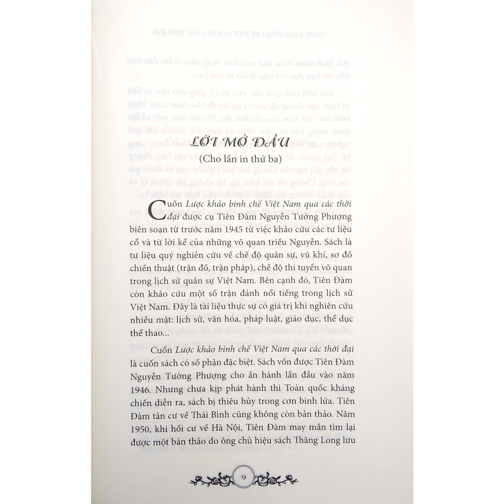 Lược Khảo Binh Chế Việt Nam Qua Các Thời Đại Cuốn Lược khảo binh chế Việt Nam qua các thời đại được cụ Tiên Đàm Nguyễn Tường Phượng biên soạn từ trước năm 1945 từ việc khảo cứu các tư liệu cổ và từ lời kể của những võ quan triều Nguyễn. Trong cuốn sách là những tư liệu quý nghiên cứu về chế độ quân sự, vũ khí, sơ đồ chiến thuật (trận đồ, trận pháp), chế độ thi tuyển võ quan trong lịch sử quân sự Việt Nam. Bên cạnh đó, Tiên Đàm còn khảo cứu một số trận đánh nổi tiếng trong lịch sử Việt Nam. Đây là tài liệu thực sự có giá trị khi nghiên cứu nhiều mặt: lịch sử, văn hóa, pháp luật, giáo dục, thể dục thể Cuốn Lược khảo binh chế Việt Nam qua các thời đại là cuốn sách có số phận đặc biệt.