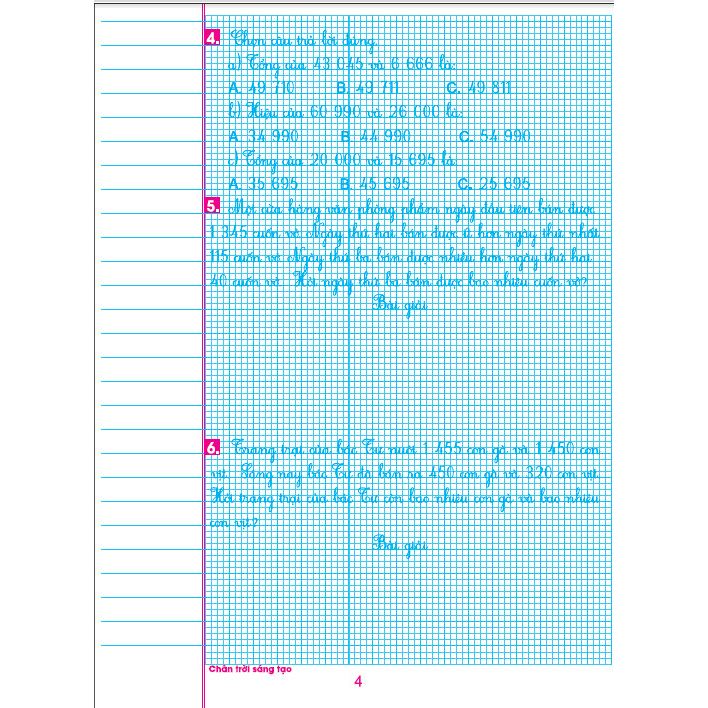 Luyện Tập Toán 4 - Trình Bày Trên Giấy Ô Li là cuốn sách do nhóm tác giả là những nhà giáo nhiều kinh nghiệm dạy ở các trường Sư phạm và chuyên viên phụ trách môn Toán tiểu học biên soạn theo chuẩn kiến thức, kĩ năng của SGK Chân Trời Sáng Tạo của Bộ Giáo dục và Đào tạo, với mục đích: Cung cấp tài liệu để giáo viên tham khảo, nhằm đổi mới phương pháp dạy học và luyện tập cho học sinh học buổi thứ hai. Hỗ trợ cho học sinh khả năng tự học, tự rèn luyện kiến thức cơ bản đã học và phát triển năng lực tư duy toán học một cách thông minh, * Góp phần