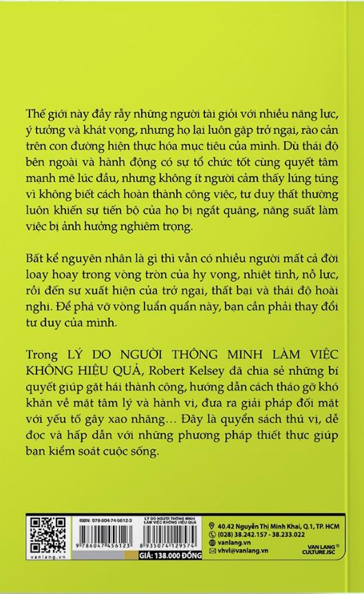 Trong LÝ DO NGƯỜI THÔNG MINH LÀM VIỆC KHÔNG HIỆU QUẢ, Robert Kelsey đã chia sẻ những bí quyết giúp gặt hái thành công, hướng dẫn cách tháo gỡ khó khăn về mặt tâm lý và hành vi, đưa ra giải pháp đối mặt với yếu tố gây xao nhãng… Đây là quyển sách thú vị, dễ đọc và hấp dẫn với những phương pháp thiết thực giúp bạn kiểm soát cuộc sống.