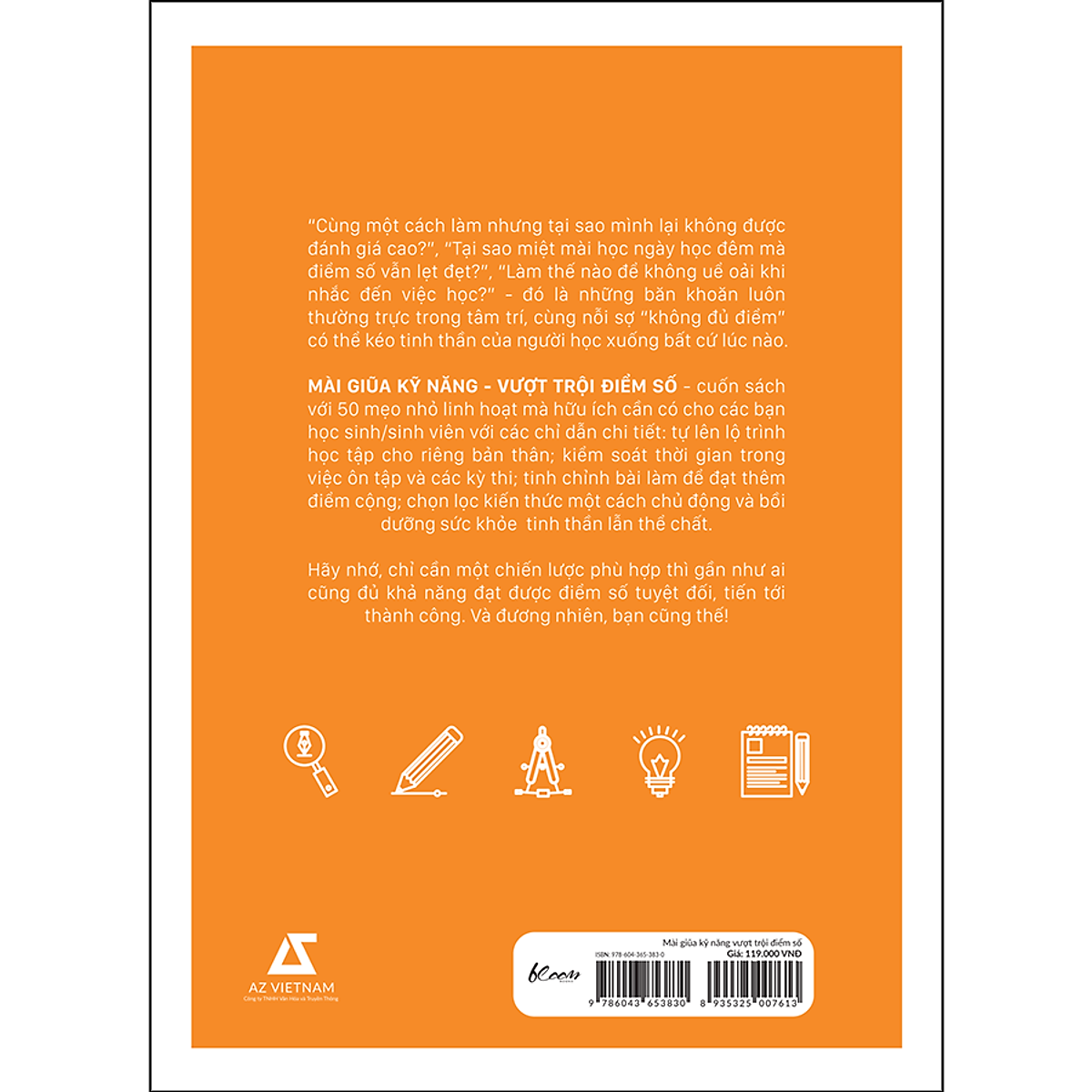 MÀI GIŨA KỸ NĂNG – VƯỢT TRỘI ĐIỂM SỐ với 50 mẹo nhỏ linh hoạt mà hữu ích cần có cho các bạn học sinh/sinh viên với các chỉ dẫn chi tiết: tự lên lộ trình học tập cho riêng bản thân; kiểm soát thời gian trong việc ôn tập và các kỳ thi; tinh chỉnh bài làm để đạt thêm điểm cộng; chọn lọc kiến thức một cách chủ động và bồi dưỡng sức khỏe tinh thần. Đây cũng là cuốn sách thứ 3 trong bộ Cẩm nang sinh viên, được viết bởi Stella Cottrell – chuyên gia giáo dục và hướng nghiệp người Anh, tác giả của Lộ trình bạn đi Tương lai bạn chọn và Tháo gỡ căng thẳng Mở lối tiềm năng – những cuốn sách hữu ích nổi tiếng với các bạn trẻ.