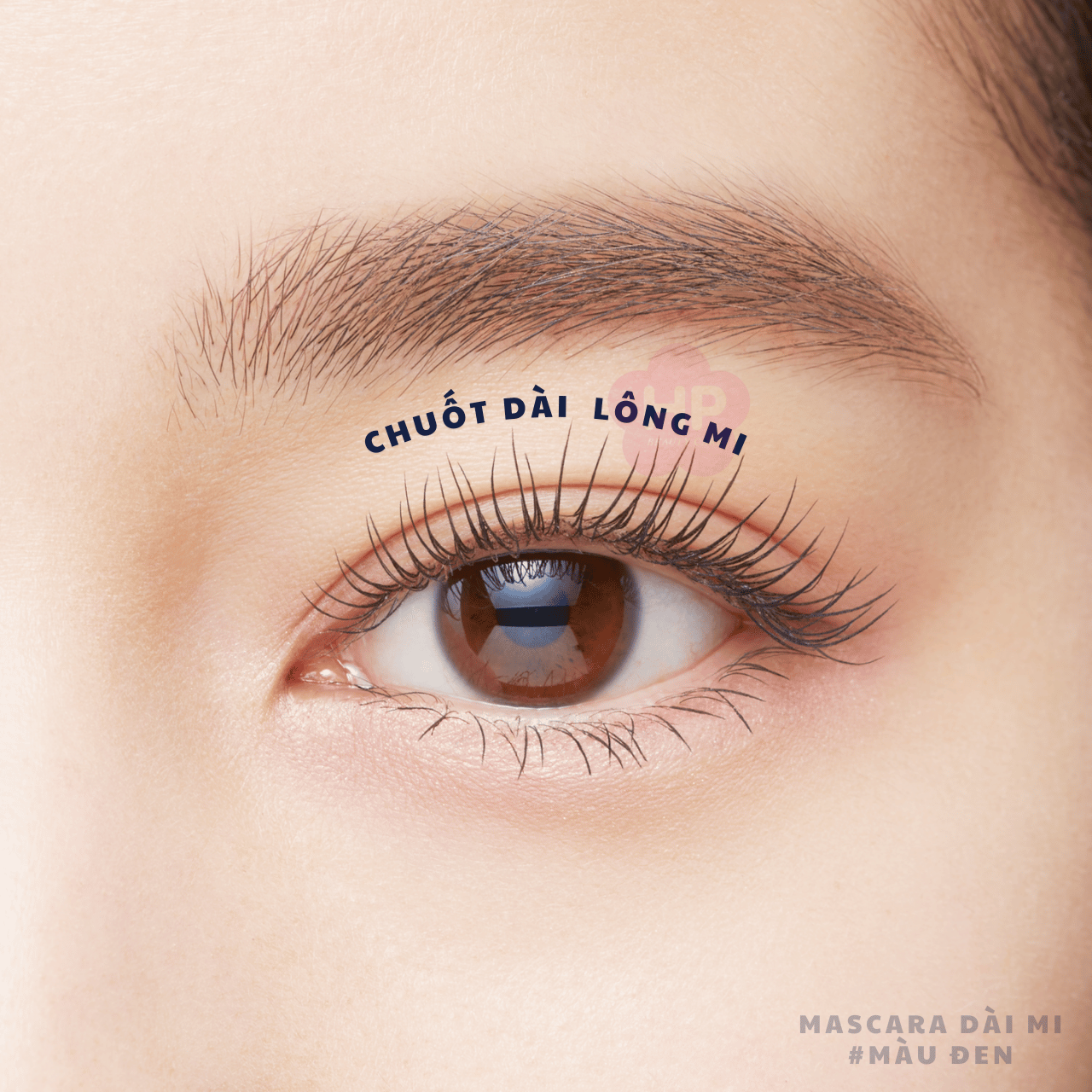 - Dùng đầu chải mascara vuốt ½ Đuôi mi rồi đến ½ Đầu mi còn lại (vuốt theo hướng ra ngoài).
