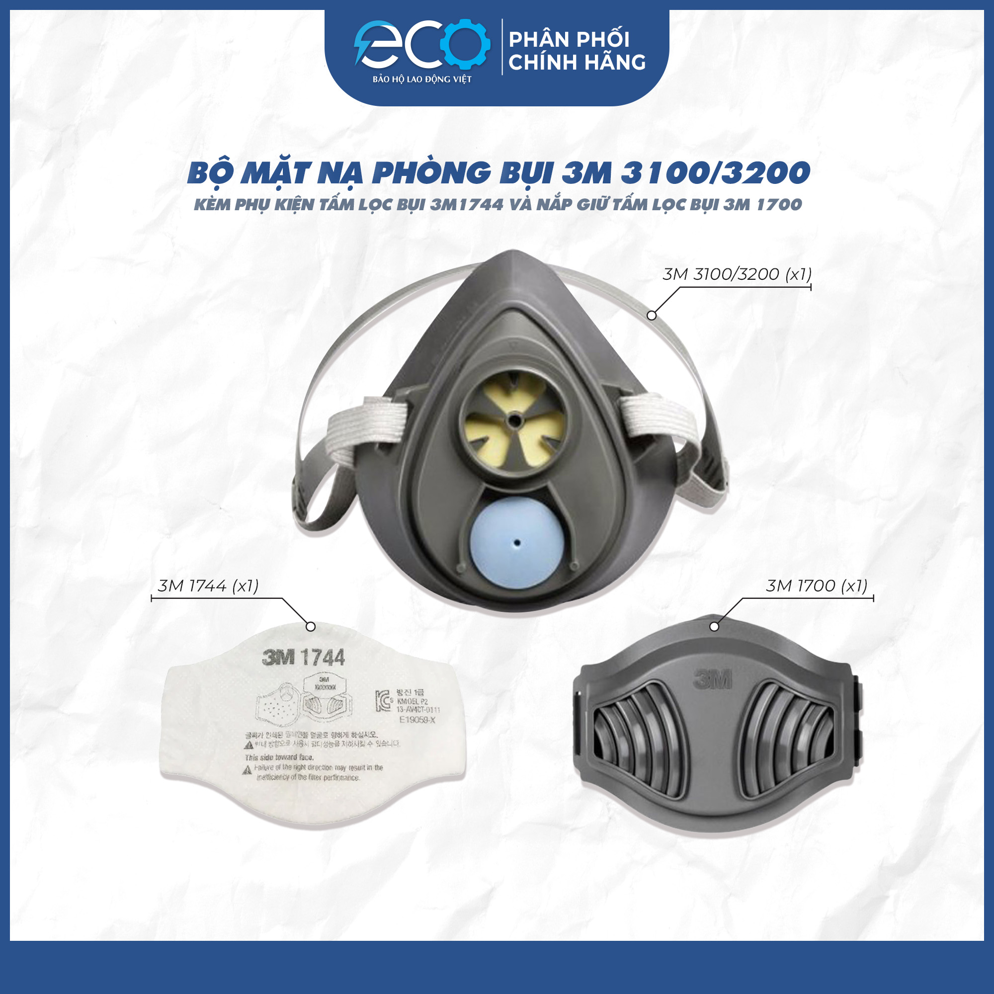 Bộ Mặt Nạ Phòng Bụi 3M gồm có: + 1 cái Mặt Nạ 3M 3100, 3200 + 1 Tấm lọc bụi 3M 3M 1744 + 1 Nắp Giữ Tấm Lọc Bụi 3M 1700 Mặt
