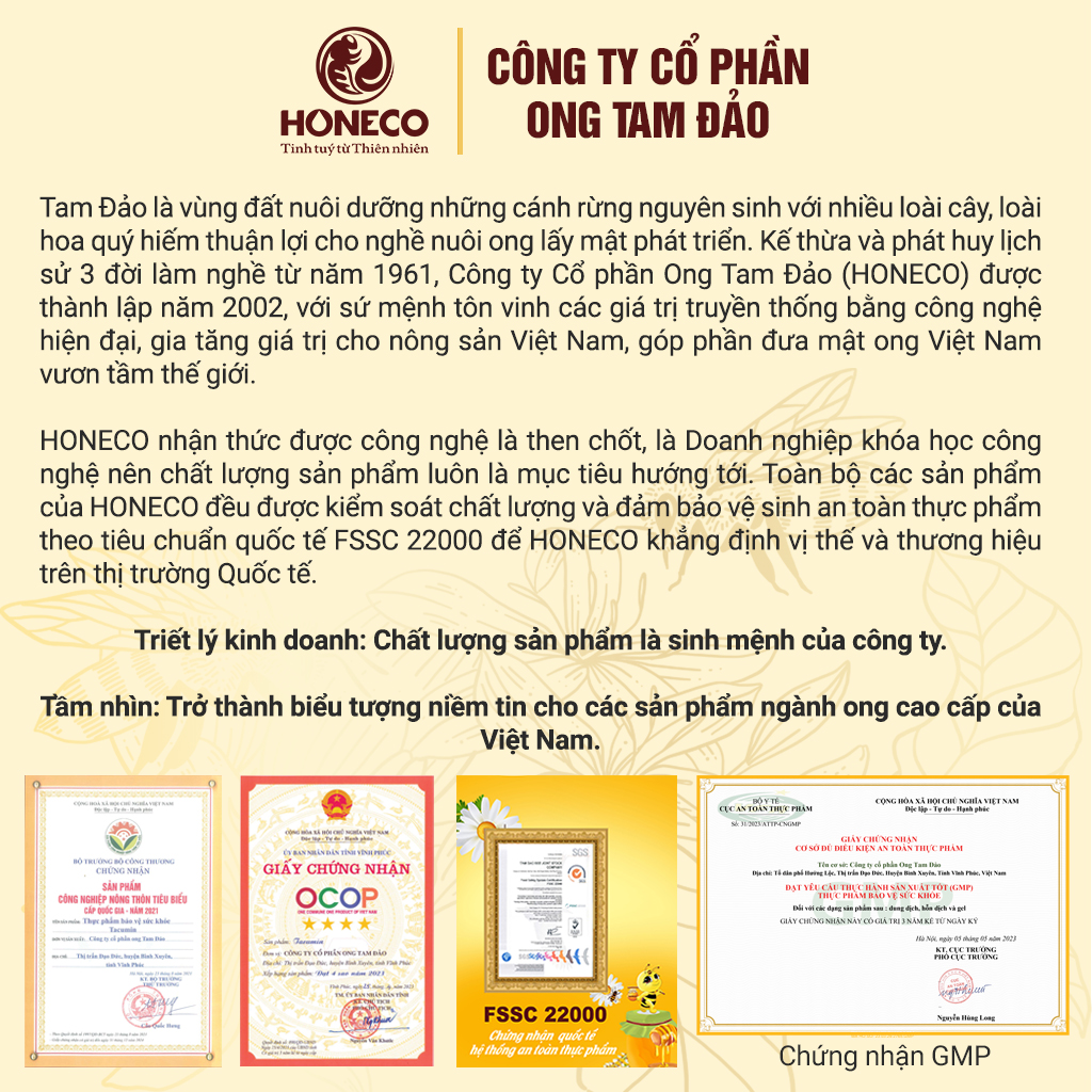 Mật ong chín Honimore Hoa miền núi được khai thác chủ yếu ở các tỉnh miền núi, rừng thuộc khu vực Tây Bắc Việt Nam và các vùng cây đặc sản. Ở Phương Bắc, vào mùa đông có hoa Bạc hà, hoa Xuyến chi, hoa Yên bạch nở rộ từ Hà Giang tới Sơn La cho vị mật sánh dẻo, thơm ngát. Mùa xuân, các vùng thấp như Hưng Yên, Bắc Giang có mật nhãn, mật vải thiều thơm nức, ngọt lịm. Mùa hè, ở Điện Biên có rừng sồi, rừng dẻ... lâu năm cho vị mật đậm đà mùi thân gỗ. Tất cả các loại mật này sau khi khai thác, được phối theo công thức bí quyết riêng của Honimore, tạo nên Mật ong chín Honimore Hoa Miền Núi, sánh đặc, thơm ngon, giàu dưỡng chất. Tại nhà máy, mỗi loại mật đều được: • Kiểm soát chất lượng bởi kỹ sư thực phẩm • Lọc sạch tạp chất • Tạo gu riêng cho từng dòng sản phẩm (nếu là mật đa hoa) • Mật đơn hoa thì để riêng, giữ hương vị nguyên bản • Phối trộn bằng công nghệ chân không lạnh, giúp giữ nguyên dưỡng chất và mùi vị tự nhiên • Bảo quản trong bồn Inox 304 an toàn thực phẩm Sản phẩm có hồ sơ công bố chất lượng theo đúng quy định pháp luật. Mật ong chín Honimore Hoa miền núi là kết quả của một hành trình dài: Từ những cánh rừng phía Bắc tới vùng cây đặc sản. Qua tay những người làm ong bằng cả sự yêu nghề và hiểu nghề, trải qua quy trình xử lý bài bản, sạch sẽ, nghiêm túc . Và cuối cùng là đến tay người thật sự trân quý mật ong đúng nghĩa. I. Thông tin sản phẩm - Tên sản phẩm: Mật ong chín Hoa Miền Núi - Thương hiệu: Honimore - Quy cách đóng gói: Chai, hũ thủy tinh - Khối lượng: 630g (Chai), 360g (Hũ) - Hạn sử dụng: 36 tháng kể từ ngày sản xuất - Giấy kiểm nghiệm số AR-23-VD-042970-01 được cấp bởi Eurofins II Đặc điểm nổi bật Vì sao mua mật ong lại nên chọn Mật Ong Chín? Trong tiềm thức của nhiều người Việt, mật ong ngon là phải mật ong rừng, nguyên chất, tự nhiên, phải “gửi người quen săn mật mới yên tâm”. Có người mua mật ong đóng chai mà vẫn chưa hoàn toàn tin tưởng, chỉ vì… chưa thấy con ong đâu. Họ mua vì niềm tin vào người bán - và đôi khi là tạm tin như vậy thôi. 1. Ký ức về thời săn mật Ngày xưa, ngành nuôi ong gần như chưa có. Ở quê, bà con sống gần núi rừng, gần vườn cây như cà phê, nhãn, chôm chôm… thỉnh thoảng ong kéo về làm tổ, mật ong quý như vàng - ai gặp là lấy liền, mang về dùng hoặc chia cho người thân quen. Thế là hình thành một lớp thợ săn mật - lên rừng tìm tổ ong, hun khói đuổi ong đi để lấy cả tổ. Dù mật quý thật, nhưng: • Ong bị xua đuổi, tổ bị phá - điều mà ngành ong hiện đại trên thế giới không chấp nhận. • Mật lấy sớm, khi tổ chưa vít nắp, hàm lượng nước cao, dễ chua, dễ xì bọt. • Vắt tay, đựng bằng chậu, bằng xô, thiếu vệ sinh an toàn thực phẩm.