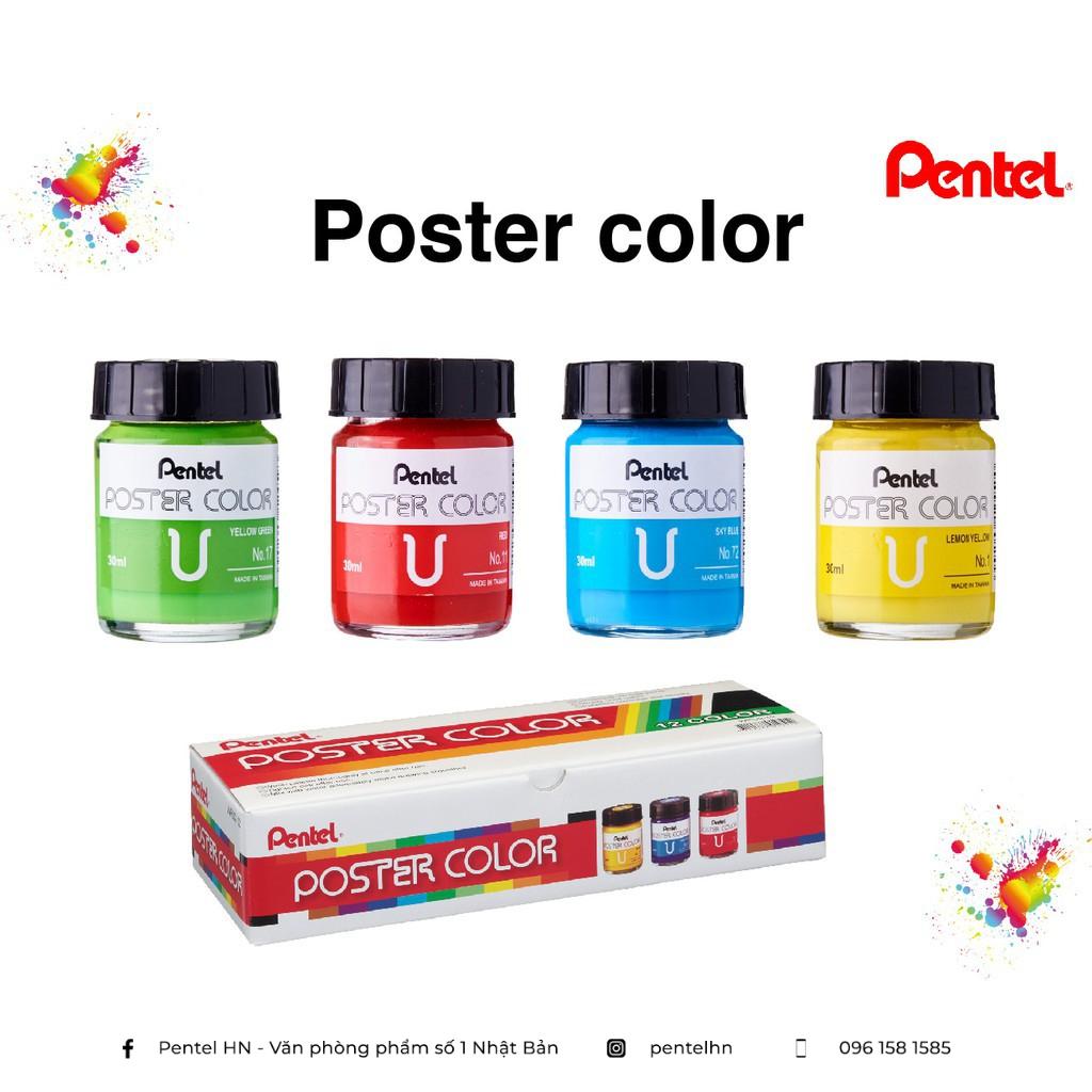 Mua tại TiktokPentel Vietnam - Văn phòng phẩm số 1 Nhật Bản - Chất lượng hàng đầu Thế Giới Thông tin sản phẩm Bộ 12 Màu Bột Poster Pentel WPU2-12 | Màu Vẽ Bền, Lâu Phai, Không Độc Hại - Màu Poster Pentel Là dạng màu bột pha nước Màu Poster Pentel có màu sắc tươi sáng, đa dạng và không độc hại. - Màu Poster Pentel có khả năng chồng màu lên nhau. - Màu Poster Pentel được bảo quản trong lọ nhựa cứng chắc chắn giúp màu được bảo quản tuyệt đối khỏi thời tiết. - Chất màu Poster Pentel đặc giúp sử dụng vô cùng tiết kiệm -Dung tích: 30ml x12 màu -Bộ 12 màu (Lọ thủy tinh) gồm: Yellow Green 17, Viridian 18, Sky Blue 72, Cobalt Blue 23, Cobalt Violet 65, Black 28, White 29, Yellow 12, Yellow Deep 62, Orange 3, Red 11, Brown 8 Ứng dụng của màu Poster