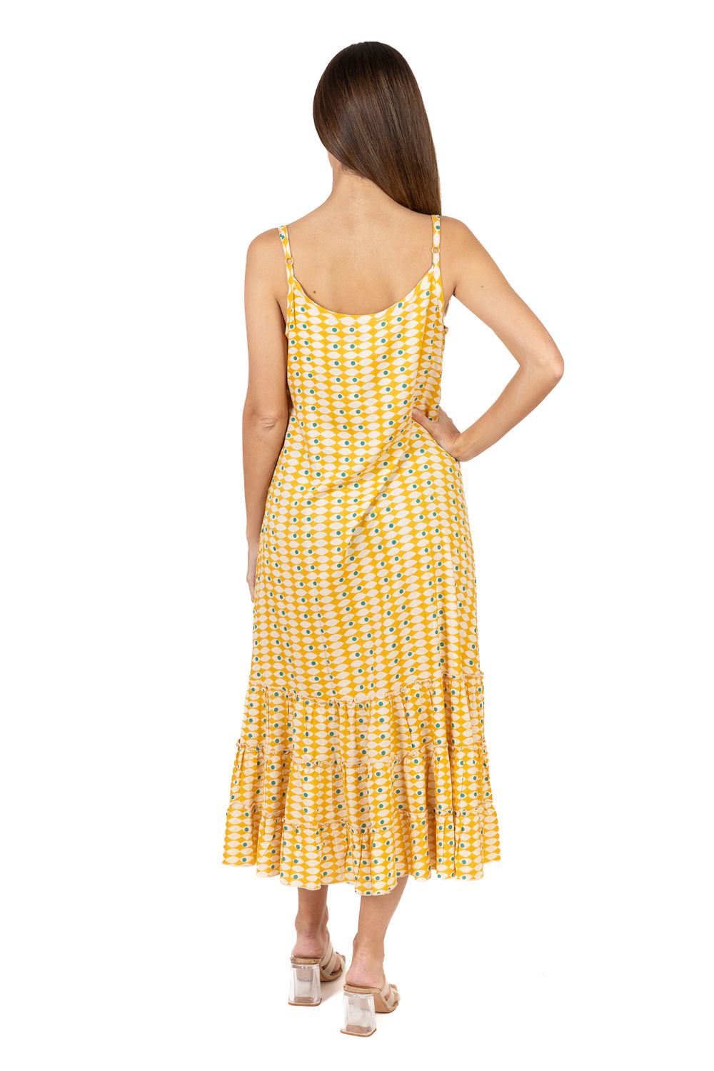 Maxi 2 Dây Isla Bonita, chất lụa mềm mại, thoáng mát. nền vải vẽ ánh kim tinh tế. Dây nơ rời cột nhẹ ở eo. Có thể mặc cột nơ hoặc không nơ như đầm
