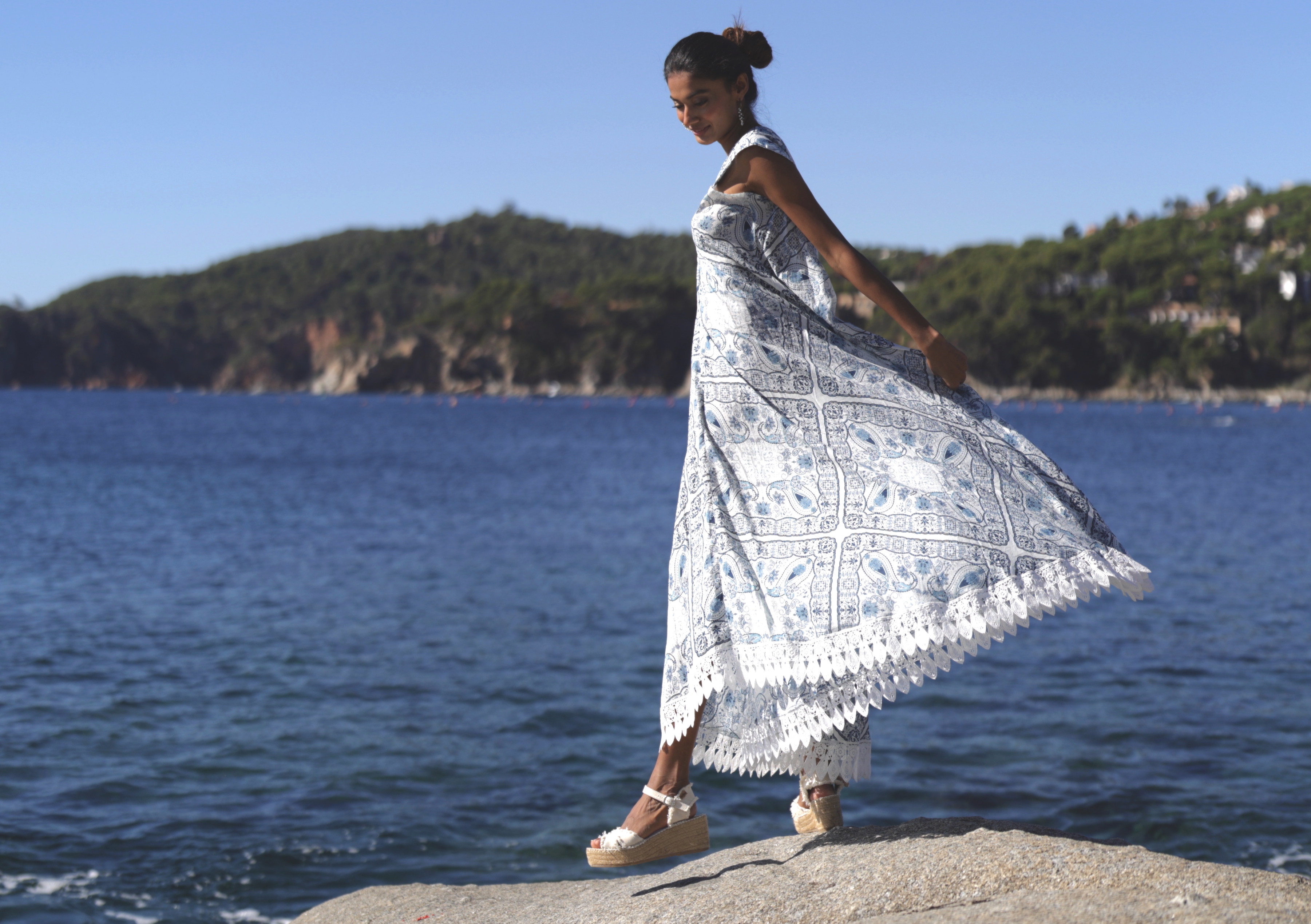 Maxi Cổ V Cotton Isla Bonita, chất liệu lụa mềm mại, cao cấp, nền vải trắng trang nhã họa tiết xanh tinh tế. Có thể mặc cổ V hoặc kéo thành trễ vai. Eo thun