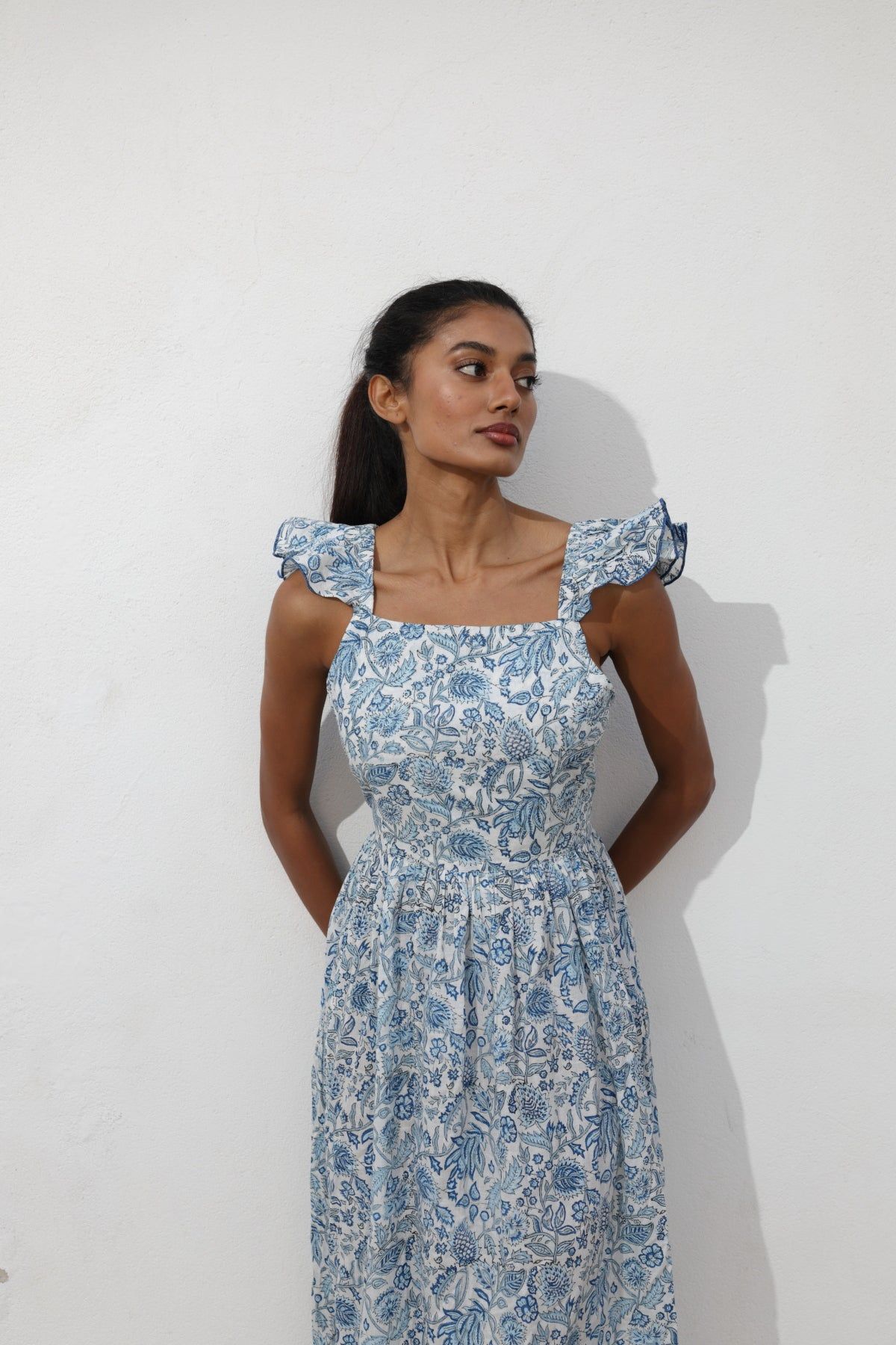 Maxi Cánh Dơi Hoa Cotton Isla Bonita, chất liệu lụa cao cấp, mềm mại, thoáng mát. Xẻ tà 2 bên. Hoa xanh nổi bật trên nền vải trắng. Đầm cánh dơi, phom rộng freestyle. Dài