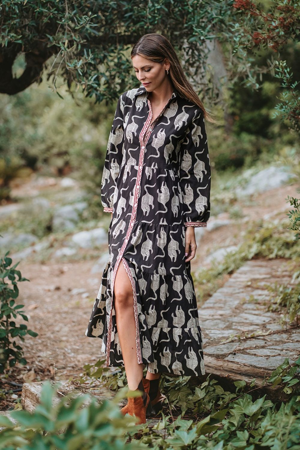 Maxi Boho Dài Tay Kết Cườm Cotton Isla Bonita, chất liệu cotton cao cấp, mềm mại, nổi bật phần ngực trước kết cườm sang trọng. Họa tiết thổ cẩm độc đáo. Phom suông. Dài Đầm