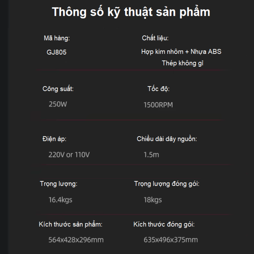 Công suất 450W Điện áp 220V/50Hz Dung tích 2.5L Màu sắc Màu Bạc Chức năng - Xay các loại thịt, cá, tôm cua - Xay rau, củ, quả - Bóc vỏ hành tỏi Chất