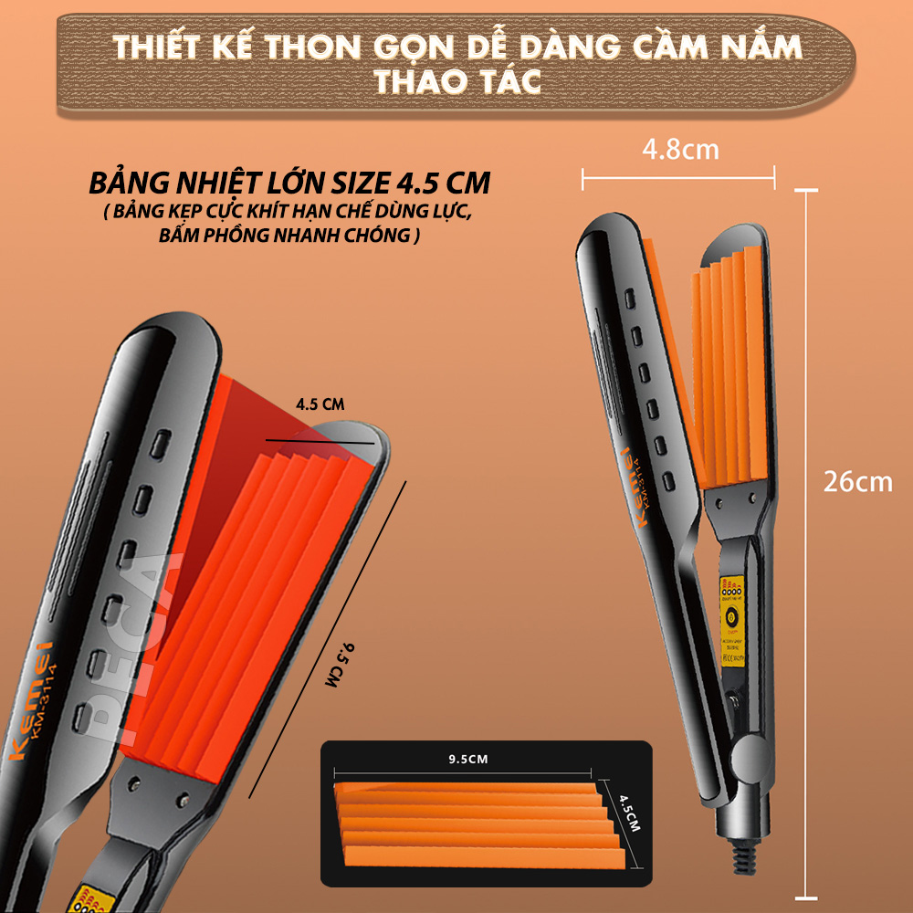 MÁY BẤM TÓC KEMEI KM-3114Y CHUYÊN NGHIỆP ĐIỀU CHỈNH 4 MỨC NHIỆT PHÙ HỢP SỬ DỤNG VỚI MỌI LOẠI TÓC - HÀNG CHÍNH HÃNG Bạn có bao giờ cảm thấy tự ti vì mái tóc mỏng, thiếu sức sống, dù đã thử đủ cách mà vẫn không thể giữ được độ phồng lâu dài? Bạn đã từng mất hàng giờ cuốn lô, dùng keo xịt nhưng chỉ sau vài tiếng, tóc lại bẹp dí, làm gương mặt trông kém sắc? Bạn không cô đơn! Rất nhiều người gặp tình trạng tóc mỏng, xẹp, đặc biệt là những ai có tóc thẳng tự nhiên hoặc từng ép tóc. Nhưng đừng lo, Máy bấm phồng chân tóc Kemei KM-3114Y chính là “cứu tinh” giúp bạn sở hữu mái tóc bồng bềnh, dày dặn chỉ trong vài phút, mà không cần đến tiệm!   ƯU ĐIỂM NỔI BẬT: Máy bấm tóc Kemei KM-3114Y sử dụng tạo nhiều kiểu tóc chuyên dụng: bấm phồng chân tóc, tạo kiểu tóc gợn sóng, tóc xù,...     1/ Ngoại quan sản phẩm: Thiết kế vỏ nhựa ABS an toàn, cứng cáp chịu lực tốt độ bền cao Màu sắc đen phối bảng cam huyền bí, cá tính, sang trọng đáp ứng mọi nhu cầu Máy có tay cầm chắc chắn, nhẹ nhàng, dây điện dài 1.7m sử dụng linh hoạt di chuyển sử dụng gốc rộng   2/ Cấu tạo bảng nhiệt: Cấu tạo ba lớp: