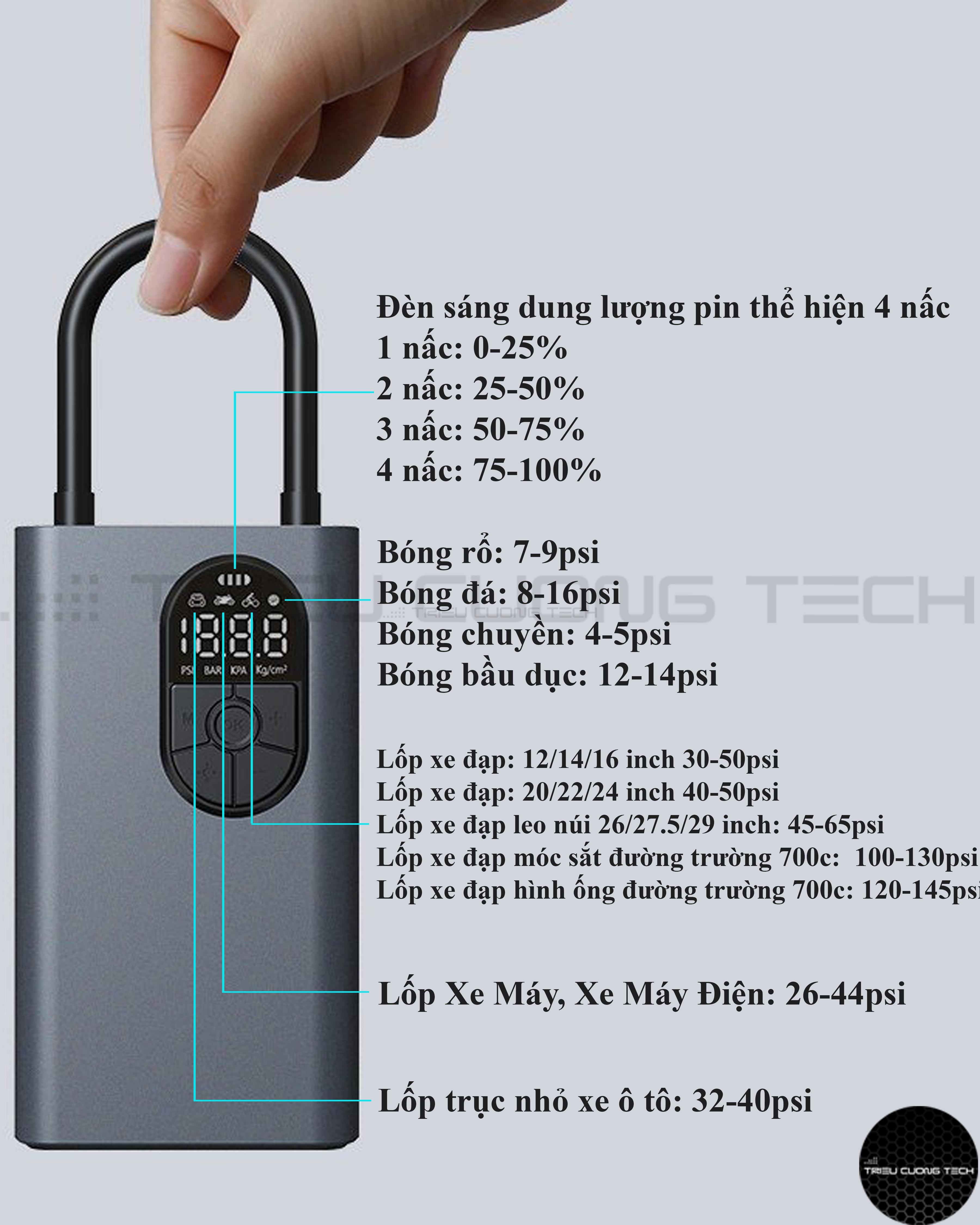 THÔNG SỐ SẢN PHẨM - Model: CQB04 - Kích thước sản phẩm: 14.1*8*4cm - Kích thước dây: 20cm - Dung lượng pin: 2000mAh - Phạm vi áp suất không khí: 0.2-8bar / 3-150psi - Input: