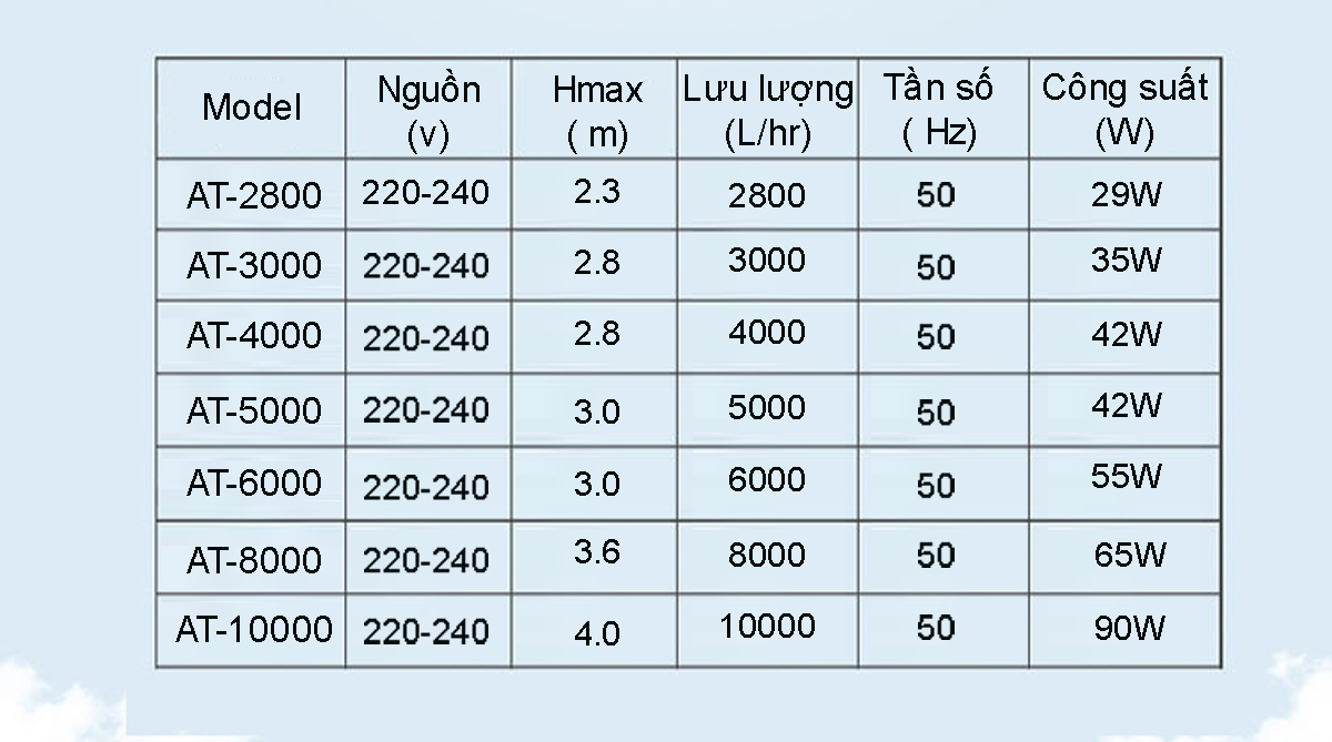 Máy bơm nước ATMAN AT3000 là dòng máy bơm tiết kiệm điện đáng tin cậy và hiệu quả dùng để bơm nước, cấp nước cho các bộ lọc, ao cá, hồ cá, thác nước hoặc đài phun nước.