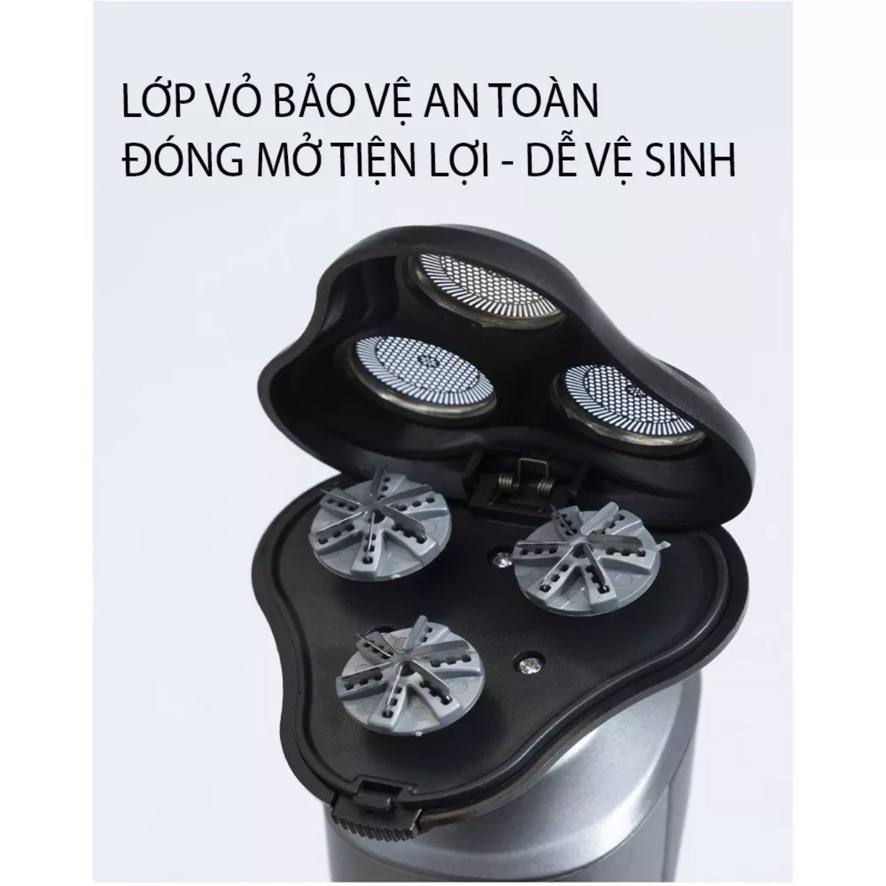 • LƯỠI XOAY ĐA CHIỀU ƯU VIỆT: 3 vòng lưỡi xoay vận hành đồng thời giúp gia tăng diện tích tiếp xúc với da, dễ dàng di chuyển tới mọi góc cạnh của khuôn mặt. Thiết kế thông minh không chạm trực tiếp, loại bỏ nỗi lo tổn thương da khi cạo râu.