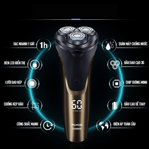 ✨Máy Cạo Râu Flyco 3 Lưỡi Kép Thân Máy Kháng Nước Sạc Nhanh 1 Giờ FS198VN - Hàng Chính Hãng