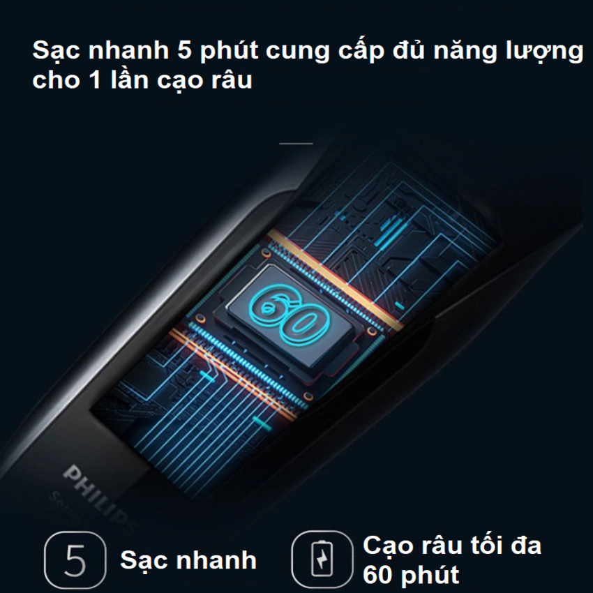 - Sạc nhanh 5 phút cung cấp đủ năng lượng cho 1 lần cạo râu: Đang vội? Cắm máy cạo râu của bạn trong 5 phút và có đủ điện cho 1 lần cạo râu hoàn toàn.