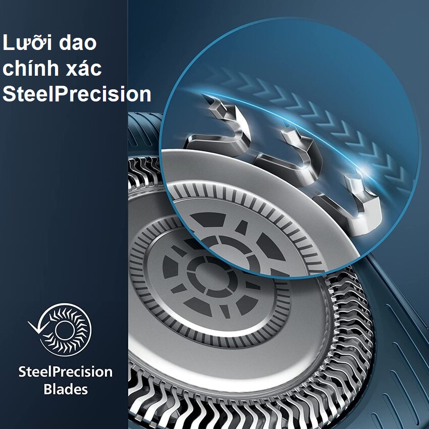 - Mạnh mẽ nhưng nhẹ nhàng, 45 lưỡi dao SteelPrecision tự mài bén trên máy cạo râu Philips này hoàn thành tối đa 90.000 thao tác cắt mỗi phút, cắt được nhiều râu hơn trong mỗi lần cạo** để có một kết quả cạo sạch sẽ, thoải mái Cảm biến thích ứng theo mật độ râu
