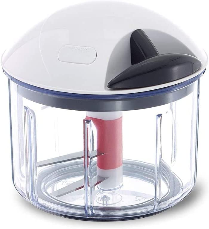 Máy cắt rau và trái cây thực tế có một dây cáp kéo và hoạt động bằng tay và không cần điện – chỉ cần kéo cho đến khi thức ăn được cắt nhỏ, chẳng hạn như hành tây, táo, các loại hạt hoặc kiwi có kích thước mong muốn.