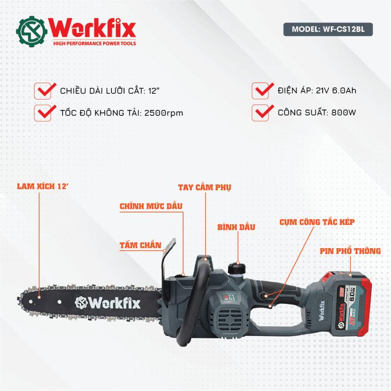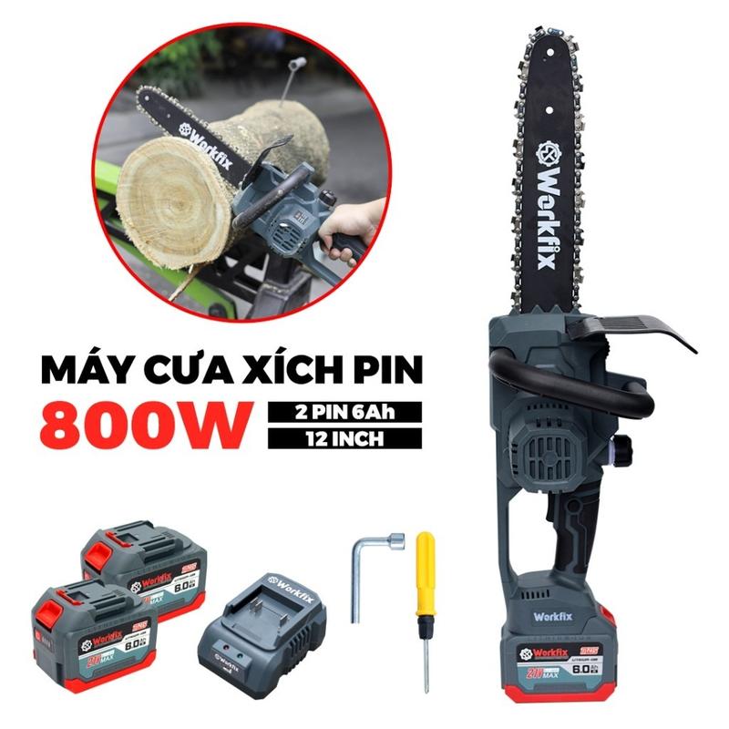 Máy Cưa Xích Pin WORKFIX 12in Lam Dài 35cm Công Xuất 800W Bơm Nhớt Tự Động Không Chổi Than Lõi Đồng