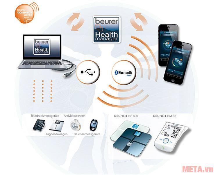 – Đồng bộ bằng Bluetooth với Iphone, Samsung, Ipad bằng phần mềm Beurer HealthManager để xem các báo cáo kết quả trên các thiết bị thông minh.