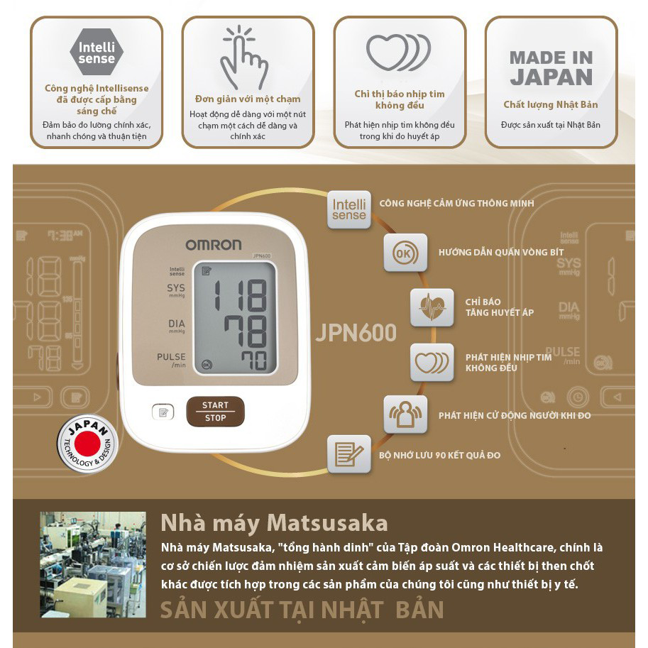 - Chiếc Máy đo huyết áp Omron JPN600 là dòng máy cao cấp được áp dụng các công nghệ tiên tiến nhất sẽ là sự lựa chọn rất đang để tâm.