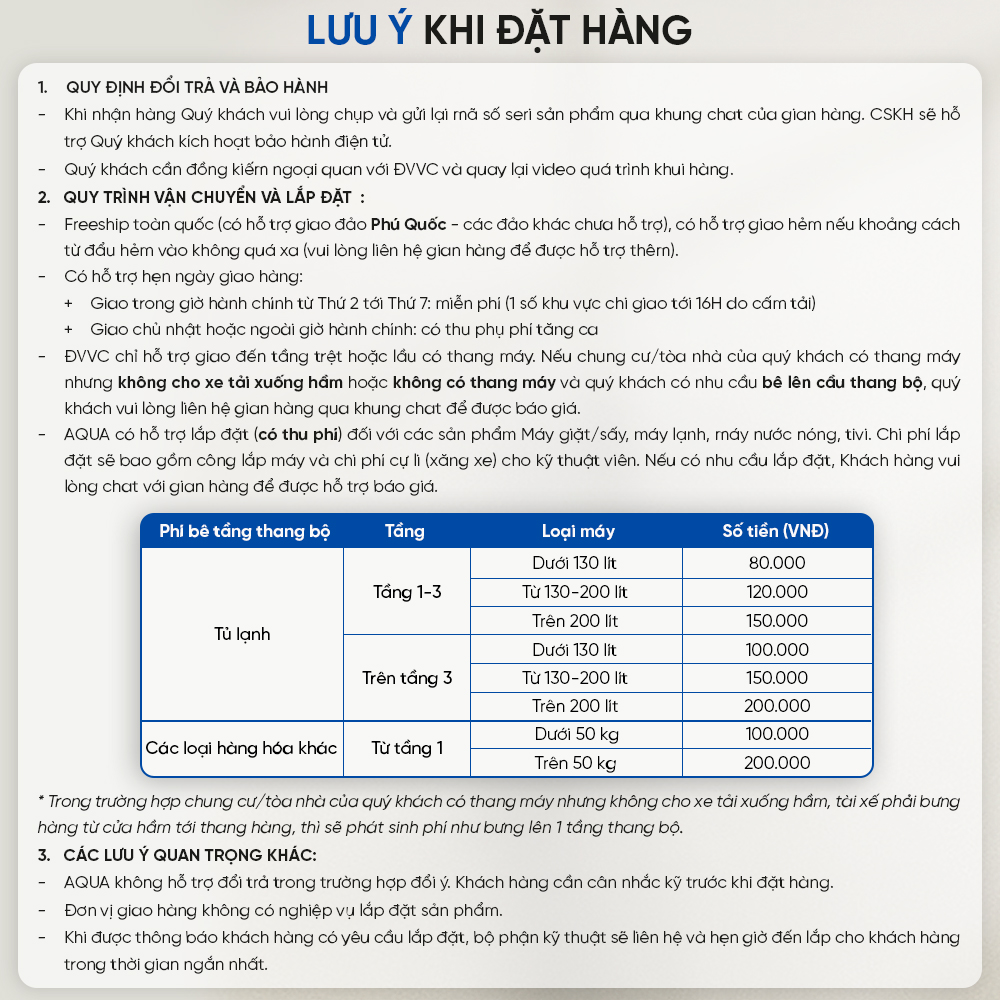 - Đối với sản phẩm máy giặt, AQUA có hỗ trợ lắp đặt trên toàn quốc (có thu phí). Quý khách có nhu cầu lắp đặt, xin vui lòng liên hệ gian hàng để được hỗ trợ