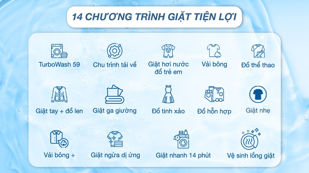 - Được trang bị 14 chương trình giặt nhằm đáp ứng tối đa các nhu cầu giặt khác nhau cụ thể: chu trình tải về, TurboWash 59, vải bông, vải bông +, giặt hơi nước đồ trẻ em, giặt ngừa dị ứng, giặt nhanh 14 phút, giặt nhẹ, giặt tay + đồ len, vệ sinh lồng giặt, đồ hỗn hợp, đồ thể thao, đồ tinh xảo, giặt ga giường. Hình ảnh chỉ mang tính chất minh họa Công nghệ giặt đặc biệt - Công nghệ AI DD sẽ mô tả lại 6 chuyển động trong quá trình giặt tay để tối ưu hóa khả năng giặt giũ từ đó ngoài loại bỏ các vết bẩn có trên quần áo mà còn đảm bảo độ bền cho sợi vải. Ngoài ra, còn tự động nhận diện khối lượng và độ mềm của quần áo nhằm đưa ra chương trình giặt phù hợp. - Công nghệ giặt TurboWash sử dụng hai vòi nước xả nhờ đó tăng áp lực nước giúp quá trình giặt nhanh chóng hơn, giúp tiết kiệm điện và nước trong suốt quá trình sử dụng. Hình ảnh chỉ mang tính chất minh họa Động cơ - Công nghệ tiết kiệm điện - sử dụng động cơ truyền động trực tiếp giúp tăng khả năng tiết kiệm điện, hạn chế tiếng ồn và rung lắc đảm bảo độ bền cao hơn.