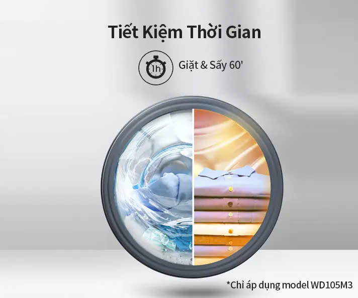 - Chương trình Giặt & Sấy 60' với công nghệ Sấy Đa Chiều Xoắn Ốc, quần áo dưới 1kg, giặt trong 15 phút, sấy trong 45 phút và có thể mặc ngay mà không cần phơi khô, giúp bạn tiết kiệm thời gian đáng kể.