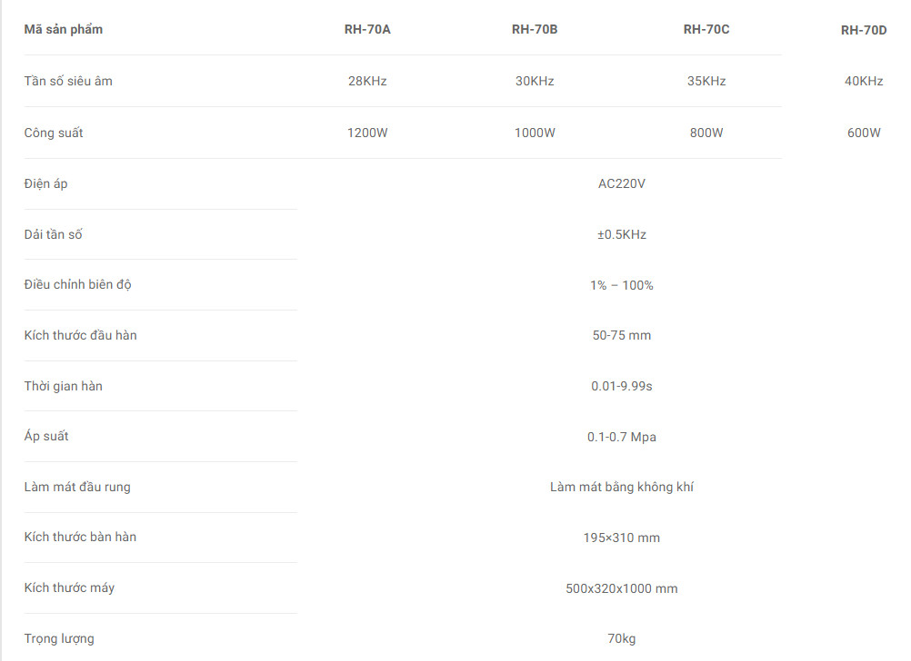 Máy hàn siêu âm Rama RH-70 được chia thành model RH-70A, RH-70B, RH-70C và RH-70C. Các mã sản phẩm này có sự khác biệt về công suất và tần số siêu âm, chúng mang đến hiệu quả ứng dụng cao cho nhiều loại vật liệu và đặc điểm khác nhau của đồ vật.