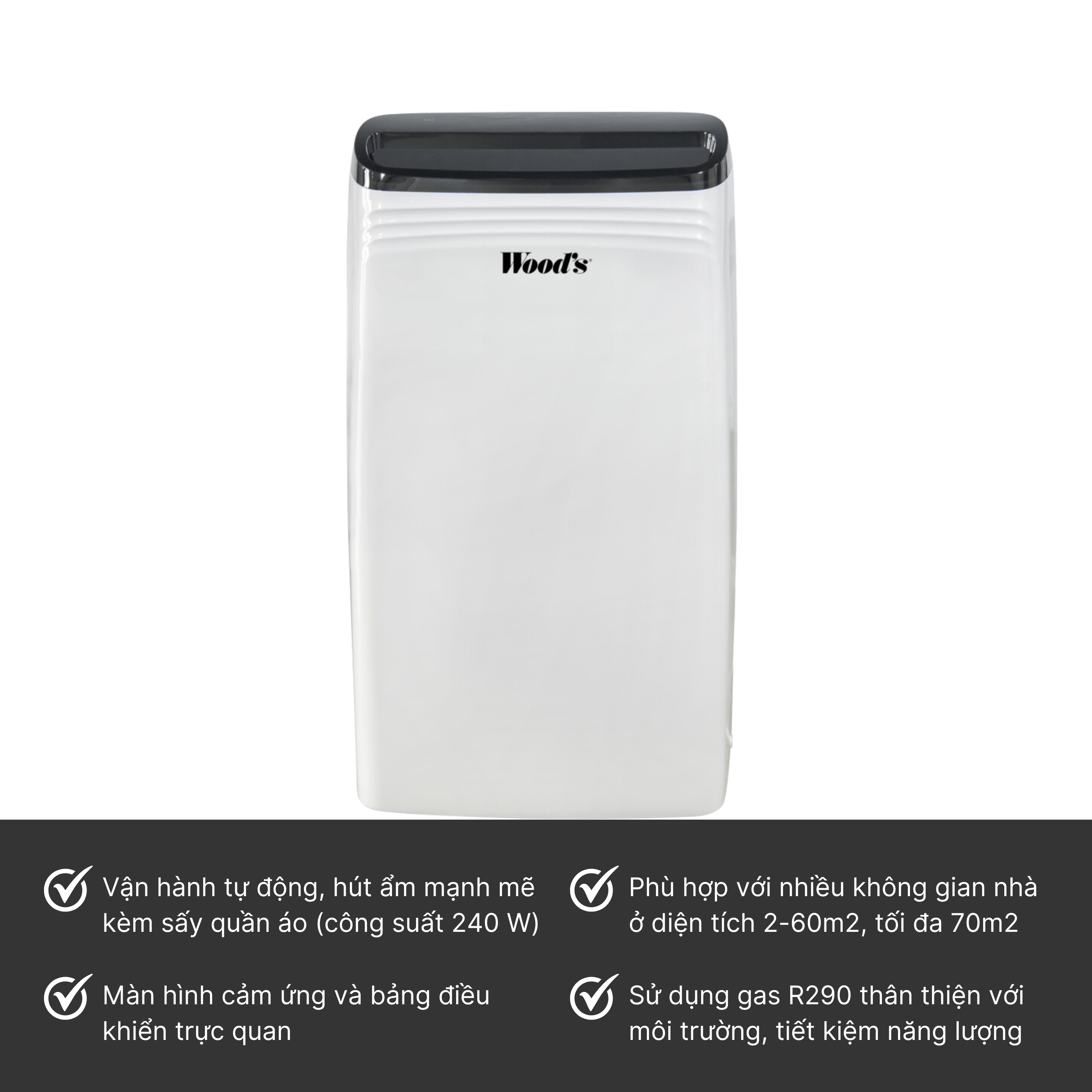 - Máy hút ẩm Wood’s MDK21 đích thực là một thiết bị thông minh và có khả năng vận hành mạnh mẽ, mang lại nhiều lợi ích thiết thực trong cuộc sống hàng ngày của bạn Phù hợp với nhiều không gian nhà ở Với chiều cao 59,6 cm, chiều rộng 34,6 cm và chiều sâu 25,3 cm, đồng thời đạt tiêu chuẩn IPX1 với khả năng chống nước nhỏ giọt phương thẳng đứng, máy hút ẩm Wood’s MDK21 cực kỳ phù hợp với nhiều không gian trong căn nhà của bạn như nhà tắm, phòng sấy đồ giặt là, các tầng hầm cỡ nhỏ, nhà hóng mát trong vườn, nhà lưu động, hoặc các khu vực tương tự với diện tích tối đa lên tới 70 m2. Dễ dàng sử dụng