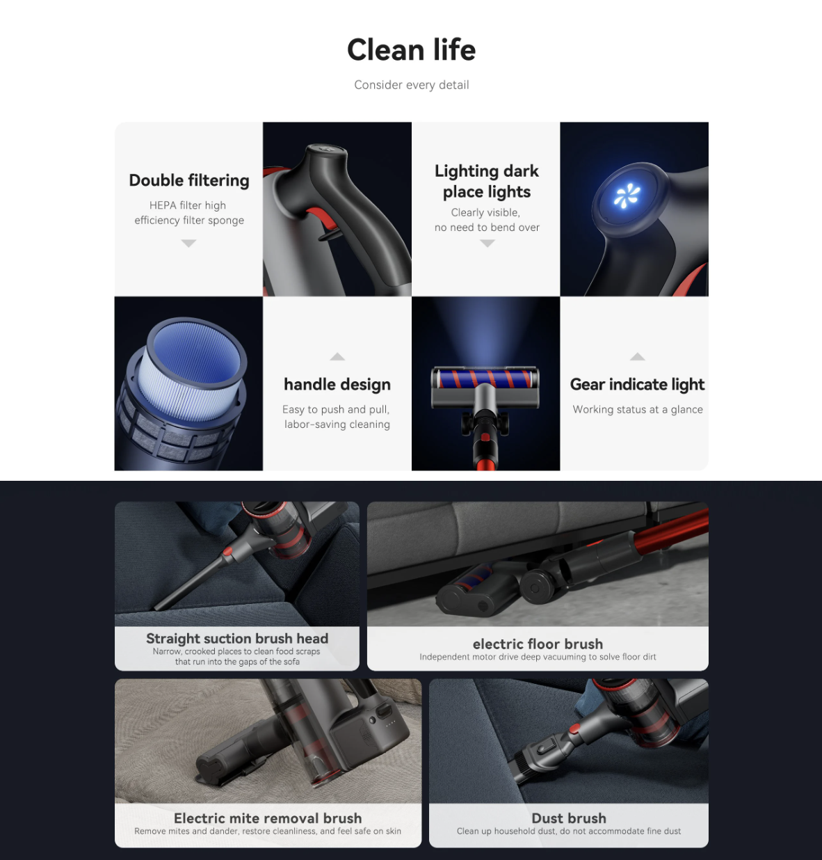 Lydsto V10 là một thiết bị đa chức năng mà bạn không chỉ có thể thu gom bụi và các mảnh vụn khác trên sàn mà còn có thể dọn dẹp nội thất ô tô, hộp bụi, hộp đựng và những nơi khó tiếp cận khác, thậm chí có thể làm sạch khăn trải giường và đồ nội thất bọc !