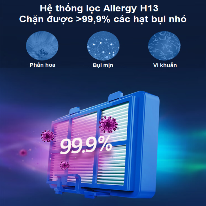 - Hệ thống lọc hoàn toàn khép kín và chặn được >99,9% các hạt bụi nhỏ, kể cả phấn hoa, lông thú nuôi và mạt bụi, bảo vệ những người mắc bệnh dị ứng và đáp ứng nhu cầu vệ sinh cao hơn của một số người dùng. Cấp độ lọc tương đương với HEPA 13**. Bàn chải mềm được gắn sẵn vào tay cầm, luôn sẵn sàng để sử dụng