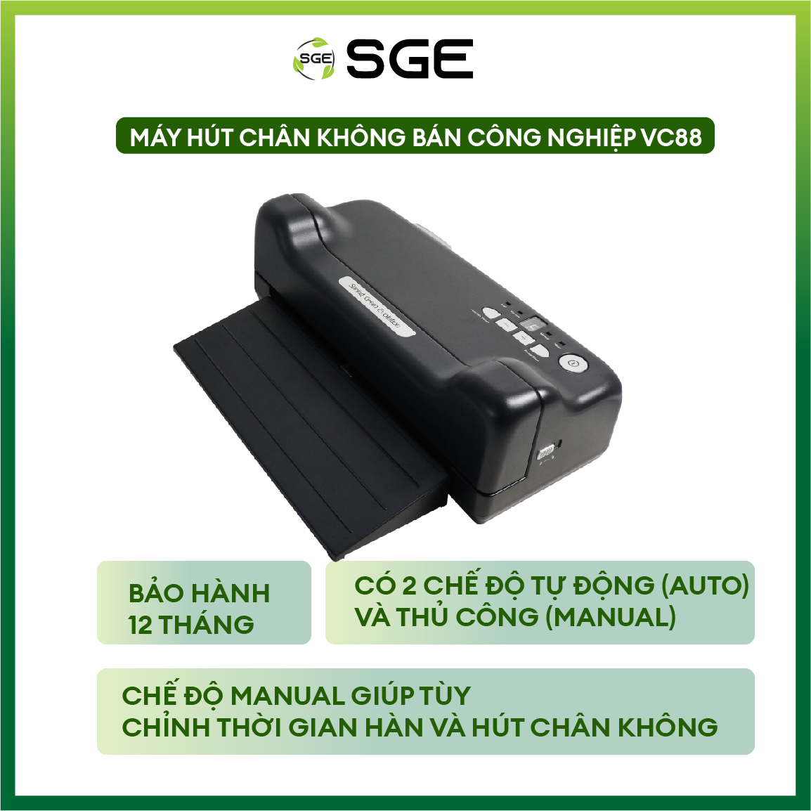 Máy hút chân không VC88 bán công nghiệp, loại máy chủ lực, chính hãng mà SGE là đơn vị duy nhất thiết kế và phát triển. Máy hút chân không bán tự động có thể