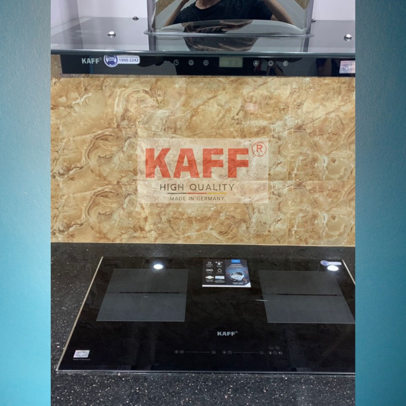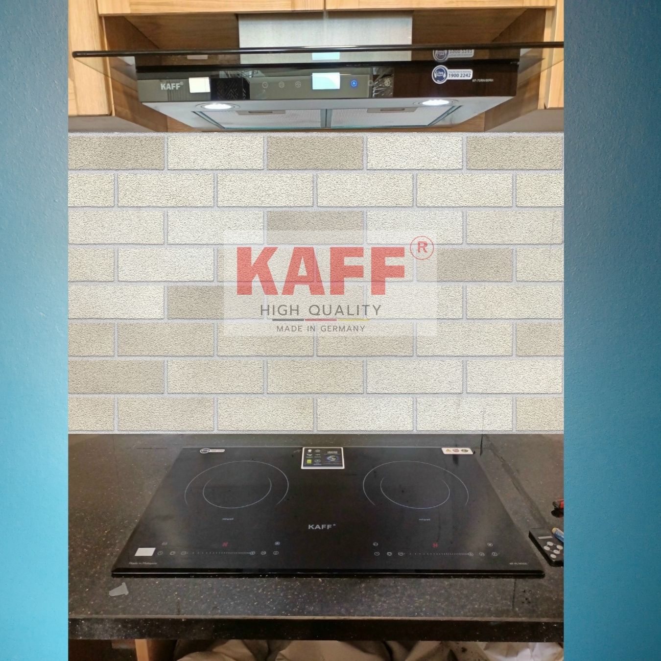 Máy hút mùi cổ điển Kaff Thương hiệu Đức tiêu chuẩn Châu Âu Thân làm bằng thép sơn tĩnh điện Động cơ đôi 2 x 80W Bóng đèn Halogen 2 x 40W Điều khiển bằng