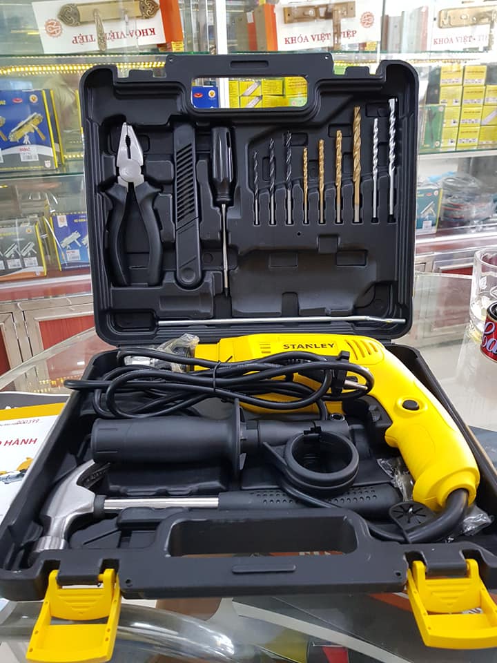 Stanley SDH600KV bao gồm: 1 búa nhổ đinh, 1 kìm, 1 dao cắt giấy, 1 tua vít, 3 mũi gỗ, 4 mũi khoan kim loại và 2 mũi khoan tường gạch. Ngoài ra máy khoan động lực còn đi kèm hộp đựng nhựa bảo quản máy.