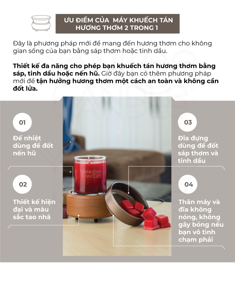 - Vừa làm đốt nến lãng mạn, vừa xông tinh dầu thơm ngát - Khuếch tán mùi thơm, tinh dầu thơm dễ chịu, khử mùi hôi triệt để, đặc biệt hiệu quả với không gian