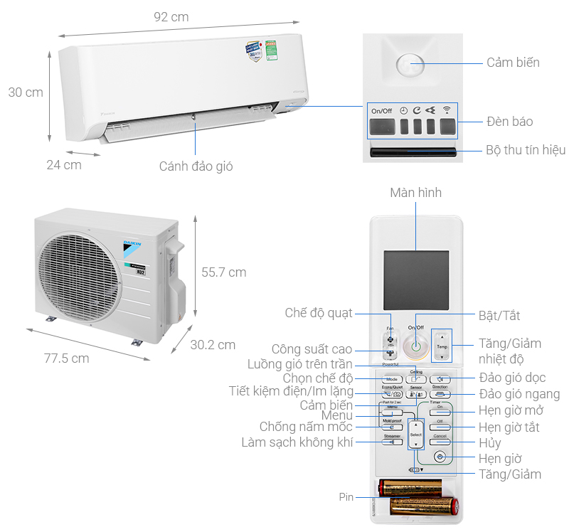 LƯU Ý: ● ĐƠN HÀNG KHÁCH Ở HỒ CHÍ MINH --- SHOP GIAO MIỄN PHÍ (TRỪ CẦN GIỜ). THÔNG TIN SẢN PHẨM: Phạm vi làm lạnh hiệu quả: Dưới 15m² (từ 30 đến 45m³) Công suất sưởi ấm: Không có sưởi ấm Lưu lượng gió lạnh (m³/phút): Cao: 7.8 - Trung bình: 6.7 - Thấp: 5.0 Dòng điện hoạt động: 5A Độ ồn trung bình: 50 dB Dòng sản phẩm: 2025 Sản xuất tại: Thái Lan Chất liệu dàn tản nhiệt: Ống dẫn gas bằng Đồng - Lá tản nhiệt bằng Nhôm Loại Gas: R-32 Tiêu thụ điện: 0.92 kW/h Nhãn năng lượng: 5 sao (Hiệu suất năng lượng 4.28) Công nghệ tiết kiệm điện: Dual inverterEnergy Ctrl - Kiểm soát năng lượng chủ động 4 mức Lọc bụi, kháng khuẩn, khử mùi: Bộ lọc PM 2.5Màng lọc sơ cấp Chế độ gió: Điều khiển lên xuống tự động, trái phải tùy chỉnh tay Công nghệ làm lạnh nhanh: Jet Cool Tiện ích: Chế độ ngủ đêm tránh buốt Chức năng tự chẩn đoán lỗi Công nghệ Gold-Fin chống ăn mòn Hẹn giờ bật, tắt Điều khiển bằng điện thoại, có wifi Thổi gió dễ chịu (cho trẻ em, người già) Tự khởi động lại khi có điện Chức năng tự làm sạch Kích thước - Khối lượng dàn lạnh: Dài 75.6 cm - Cao 26.5 cm - Dày 18.4 cm - Nặng 7.4 kg Kích thước - Khối lượng dàn nóng: Dài 71.7 cm - Cao 49.5 cm - Dày 23 cm - Nặng 22.1 kg Dòng điện vào: Dàn lạnh Kích thước ống đồng: 6.35/9.52