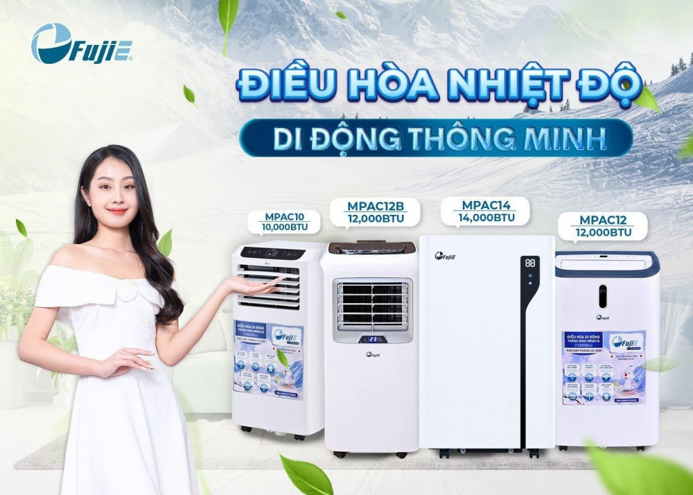 Máy điều hòa di động thông minh FujiE  công nghệ Nhật Bản Công suất 12,000BTU [ Phù hợp sử dụng cho không gian kín diện tích 20-35m2]       Vậy máy điều hòa di động là gì? Máy điều hòa di động FujiE MPAC12 thiết kế nhỏ gọn thông minh với cục nóng và cục lạnh trên cùng 1 thiết bị. Sản phẩm có khả năng làm lạnh thực thụ nhờ sử dụng máy nén, môi chất làm lạnh như một chiếc điều hòa/máy lạnh thông thường và thổi ra luồng gió mát lạnh qua cửa gió của máy.     Thiết kế thông minh, tính cơ động cao -  Nhờ thiết kế thông minh 2 bộ phận cục nóng và lạnh trên cùng 1 thiết bị, nên máy điều hòa di động FujiE MPAC12 không cần lắp đặt như các dòng gắn tường thông thường. -  Thiết kế nhỏ gọn theo phong cách hiện đại, trang nhã, màu trắng thanh lịch đi phù hợp với không gian nội thất của các gia đình trẻ. Máy được trang bị hệ thống 4 bánh xe, giúp di chuyển linh hoạt tới bất kỳ địa điểm nào mà bạn muốn: Từ phòng khách, nhà bếp, phòng làm việc cho tới phòng ngủ.     -  Bảng điều khiển điện tử cảm ứng thông minh, với giao diện trực quan dễ dàng sử dụng cho cả người trẻ và người lớn tuổi. Kết hợp điều khiển từ xa tiện lợi cho phép điều chỉnh các chức năng ở mọi vị trí trong nhà. Đa chức năng 4 in 1 Chiếc máy điều hòa di động này của thương hiệu FujiE sở hữu 4 tính năng trong cùng 1 sản phẩm: