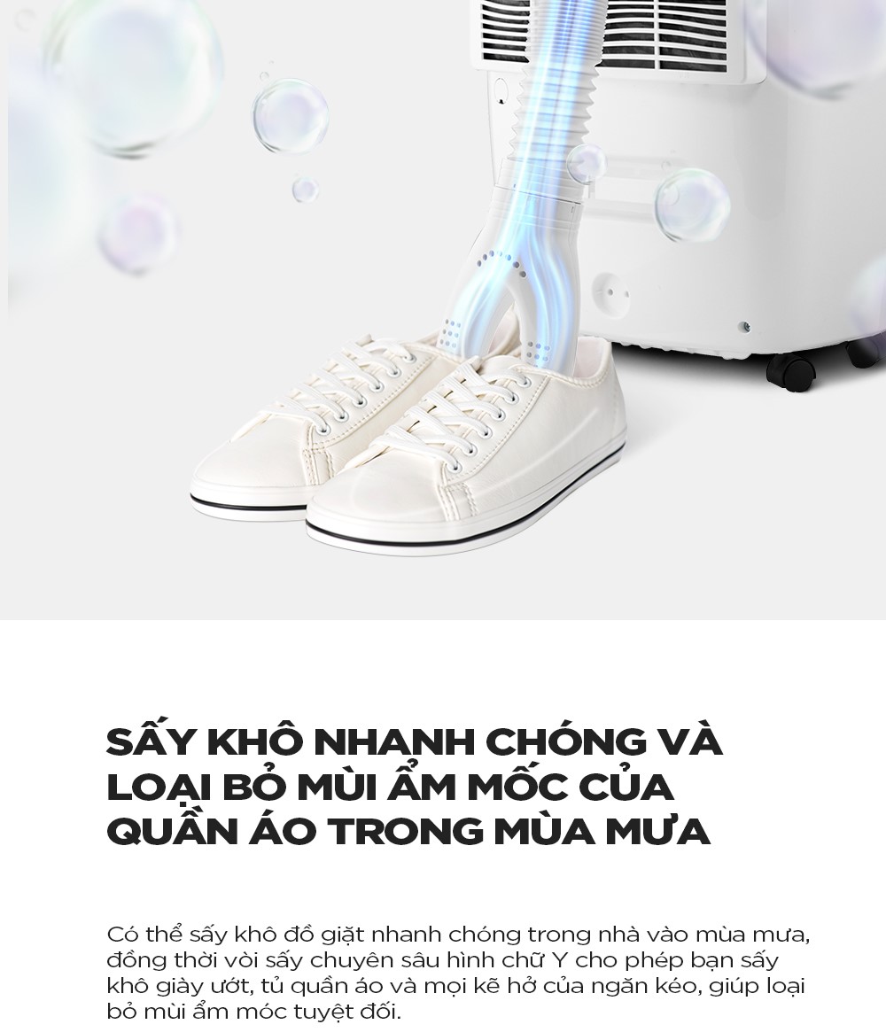 – Sấy khô nhanh chóng & loại bỏ mùi ẩm mốc của quần áo giày dép