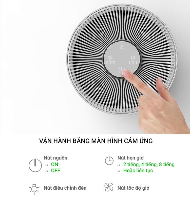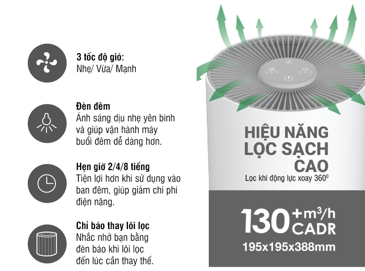 - Màng lọc than hoạt tính: loại bỏ khí độc hại, mùi khó chịu như khí thải, khí gas, mùi thức ăn, mùi ẩm mốc.Máy lọc không khí 3 mức độ lọc Máy lọc không khí Lock&Lock ENP126WHT có công suất 23W hoạt động hiệu quả trong phạm vi lọc dưới 23m². Cùng với đó là 3 mức độ lọc: nhẹ - vừa - mạnh, tùy vào tình trạng chất lượng không khí mà bạn chọn mức độ lọc cho phù hợp. Bảng điều khiển cảm ứng Bảng điều khiển cảm ứng dễ dàng tuỳ chỉnh các mức độ lọc, hẹn giờ và đèn LED chiếu sáng. Chế độ hẹn giờ tiện dụng Hẹn giờ lên đến 8 tiếng kiểm soát theo ý muốn thời gian máy lọc không khí chạy trước khi tự động tắt nguồn (2 tiếng, 4 tiếng hoặc 8 tiếng). Nhiều tiện ích thiết thực khác Chiếc máy lọc không khí Lock&Lock ENP126WHT có luồng khí 360 độ giúp lọc sạch không khí hiệu quả. Báo hiệu thay bộ lọc giúp bạn nhận biết được thời gian thay thế bộ lọc và đảm bảo chất lượng lọc khí của máy. Đèn báo hoạt động hiển thị các chức năng giúp bạn dễ dàng tùy chỉnh theo nhu cầu sử dụng. Đèn LED hỗ trợ chiếu sáng ban đêm có thể dùng như đèn ngủ, bạn có thể tùy chỉnh độ sáng của đèn vô cùng đơn giản.