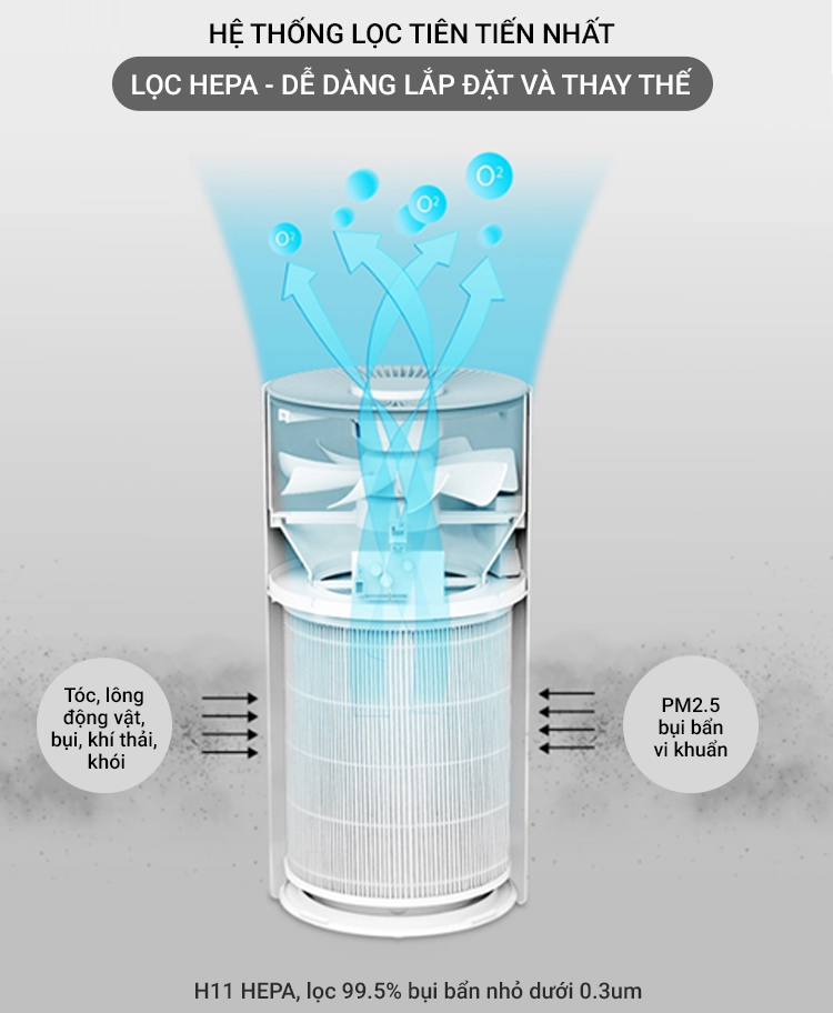 - Màng lọc HEPA H11: loại bỏ bụi mịn, khói thuốc lá, vi sinh vật như vi khuẩn, virus và nấm mốc gây bệnh.