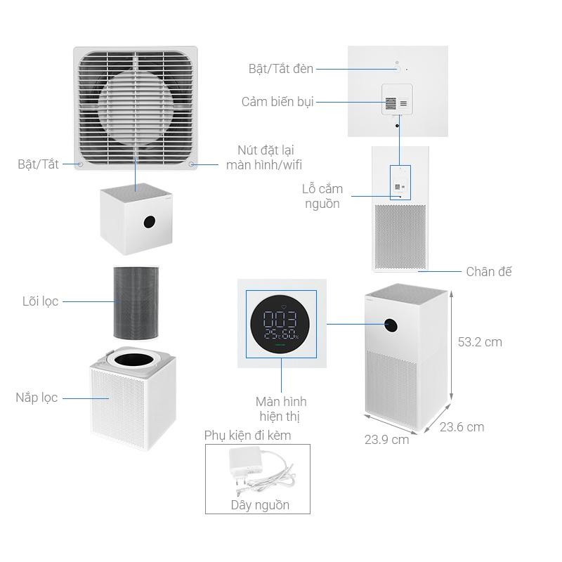 - Màn hình: Led hiển thị ( Nhiệt độ, độ ẩm, chỉ số bụi, Wifi, Chế độ lọc, màu sắc chất lượng không khí)