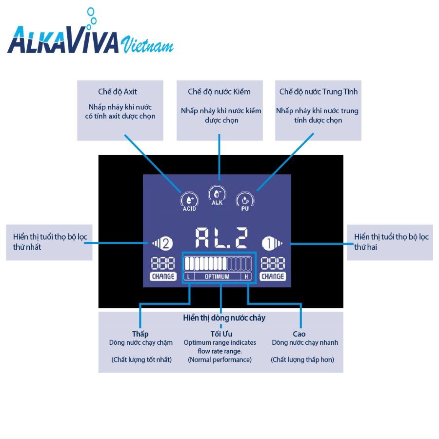 • Đội ngũ chuyên viên hùng hậu, dày dặn kinh nghiệm, luôn hỗ trợ khách hàng với sự chuyên nghiệp nhất và không ngừng đổi mới. HỆ THỐNG PHÂN PHỐI SẢN PHẨM ALKAVIVA TẠI VIỆT NAM Thương hiệu máy lọc nước điện giải đến từ Mỹ AlkaViva đã chính thức đặt chân đến Việt Nam vào tháng 12/2019 với một mong muốn duy nhất là mang đến nguồn nước sạch, giá trị dinh dưỡng cao và tuyệt đối an toàn cho người dân mọi miền đất nước hình chữ S. Với những nỗ lực không ngừng nghỉ, AlkaViva Việt Nam đã và đang có mặt ở rất nhiều địa điểm trên khắp cả nước, sẵn sàng đem đến cho khách hàng những trải nghiệm chân thực và chu đáo nhất về dòng sản phẩm sức khỏe cao cấp đến từ xứ sở Cờ Hoa. THÔNG SỐ QUAN TRỌNG TRÊN MÀN HÌNH ĐIỀU KHIỂN THÔNG SỐ KĨ THUẬT Thương hiệu Mỹ Nơi sản xuất Hàn Quốc Model MELODY II Số tấm điện cực 5 tấm điện cực  Số loại nước máy tạo ra 8 Cấu tạo điện cực 5 thanh điện giải SmartDesign làm bằng Titan phủ bạch kim (Công nghệ Nhật Bản) Tuổi thọ điện cực 25 năm  Dải pH 4.5 đến 10+ Chỉ số ORP chống oxy hóa -400mV Lõi lọc tinh Bộ lọc độc quyền UltraWater (8000 lít) VẬN HÀNH Hệ thống làm sạch tự động DARC II  Cài đặt Nước kiềm (5 chế độ) - Nước trung tính (1 chế độ) - Nước axit (2 chế độ) Màn hình điều khiển LCD cảm ứng Nhiệt độ nước đầu vào 5 độ C - 30 độ C (Không dùng với nước nóng) Áp suất nước trung bình 15 ~ 90psi Công suất lọc  Tiêu chuẩn (1.5L/phút ở 28psi/1.9bar), Tối đa (3.5L/phút ở 90psi/6.2bar) Tỉ lệ nước đầu ra 1:1 Âm thanh xác nhận bằng giọng nói Có Ngôn ngữ Tiếng Anh   THIẾT KẾ VÀ TRỌNG LƯỢNG Trọng lượng 12.75Lbs = 5.8kg Kích thước Máy: 32cm x 37cm x 17cm (Rộng x Cao x Dày) ĐIỆN NĂNG Điện áp đầu vào 220V Công suất điện tối đa 150W Cung cấp điện năng SMPS  CHÍNH SÁCH BẢO DƯỠNG VÀ BẢO HÀNH Bảo hành điện cực 5 năm Bảo hành thân máy 5 năm Bảo dưỡng định kì 6 tháng/lần, trọn vòng đời của máy Dung tích lõi lọc tinh UltraWater 8000 lít Giá thay lõi lọc tinh UltraWater 4.400.000VNĐ