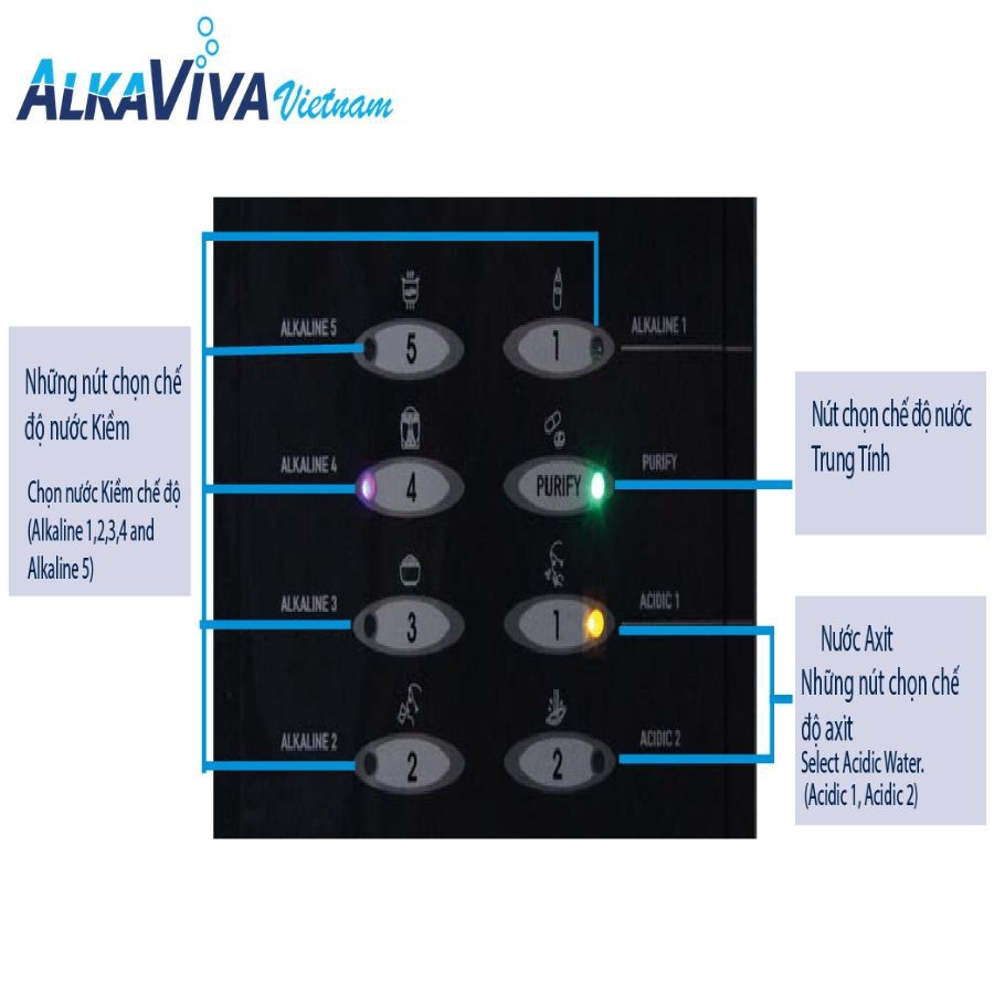 • Cung cấp các khoáng chất tự nhiên cần thiết cho cơ thể khỏe mạnh. Ngoài những tính năng tuyệt vời dành cho sức khỏe và chăm sóc sắc đẹp, nguồn nước AlkaViva còn được nhiều chuyên gia khuyên dùng như một thiết bị y tế để hỗ trợ tăng cường sức đề kháng, kiềm hóa cơ thể, trung hòa acid dư thừa và ngăn ngừa các căn bệnh mãn tính như: ung thư, tiểu đường, gout, đau dạ dày, cao huyết áp… 8 NGUỒN NƯỚC TẠO RA BỞI MÁY ĐIỆN GIẢI ALKAVIVA Máy điện giải Ion kiềm giàu Hydro của AlkaViva được sản xuất độc quyền tại Mỹ, đạt nhiều tiêu chuẩn nghiêm ngặt trên toàn thế giới. Nguồn nước AlkaViva có rất nhiều lợi ích đối với sức khỏe và môi trường như: Tăng cường trí não:       Tăng cường hoạt động trí não và bảo vệ các tế bào thần kinh Cải thiện tâm trạng:        Hỗ trợ xóa tan sự mệt mỏi, căng thẳng, cảm giác đau đầu và mất ngủ kinh niên Cân bằng pH:       Với thành phần giàu các khoáng chất có lợi tự nhiên như canxi và magiê giúp kiềm hóa và duy trì, cân bằng pH lành mạnh Tiêu hóa tốt hơn:       Hạn chế tối đa chứng trào ngược dạ dày do axit trong cơ thể gây ra và giảm chứng táo bón Bảo vệ làn da của bạn:       Uống nước nhiều sẽ giúp làn da mịn màng và trẻ trung hơn, cung cấp chất ẩm dưỡng ẩm cho da và làm đẹp tự nhiên Điều chỉnh huyết áp:       Cải thiện quá trình vận chuyển oxi và chất dinh dưỡng trong máu, cân bằng huyết áp và nhịp tim Tăng cường giải độc:       Cải thiện quá trình bài tiết độc tố và bảo vệ chức năng thận ­Giúp khớp xương khỏe mạnh:       Làm giảm các triệu chứng đau khớp do ma sát hay va đập của xương, chống loãng xương khi về già Chuyển hóa chất béo:       Tối ưu hóa chức năng của thận và gan, từ đó tăng cường quá trình chuyển hóa lượng mỡ dư thừa trong cơ thể Cung cấp năng lượng vận động:       Cải thiện hệ miễn dịch, phục hồi và cung cấp năng lượng, vận động tốt hơn Chống oxi hóa:       Trong thành phần nước có chứa nhiều chất chống oxi hóa và các loại vitamin, bảo vệ cơ thể khỏi ung thư, và chống lão hóa Giảm đau nhức cấp và mãn tính:       Vũ khí bí mật của các vận động viên thể thao, giúp phục hồi vết thương và giảm đau nhức hiệu quả Máy lọc nước điện giải AlkaViva tạo ra đến 8 nguồn nước riêng biệt. Mỗi nguồn nước sẽ phù hợp với từng nhu cầu sinh hoạt hằng ngày của người sử dụng, được hiển thị vô cùng trực quan trên những nút điều khiển cảm ứng chỉ với một lần chạm.