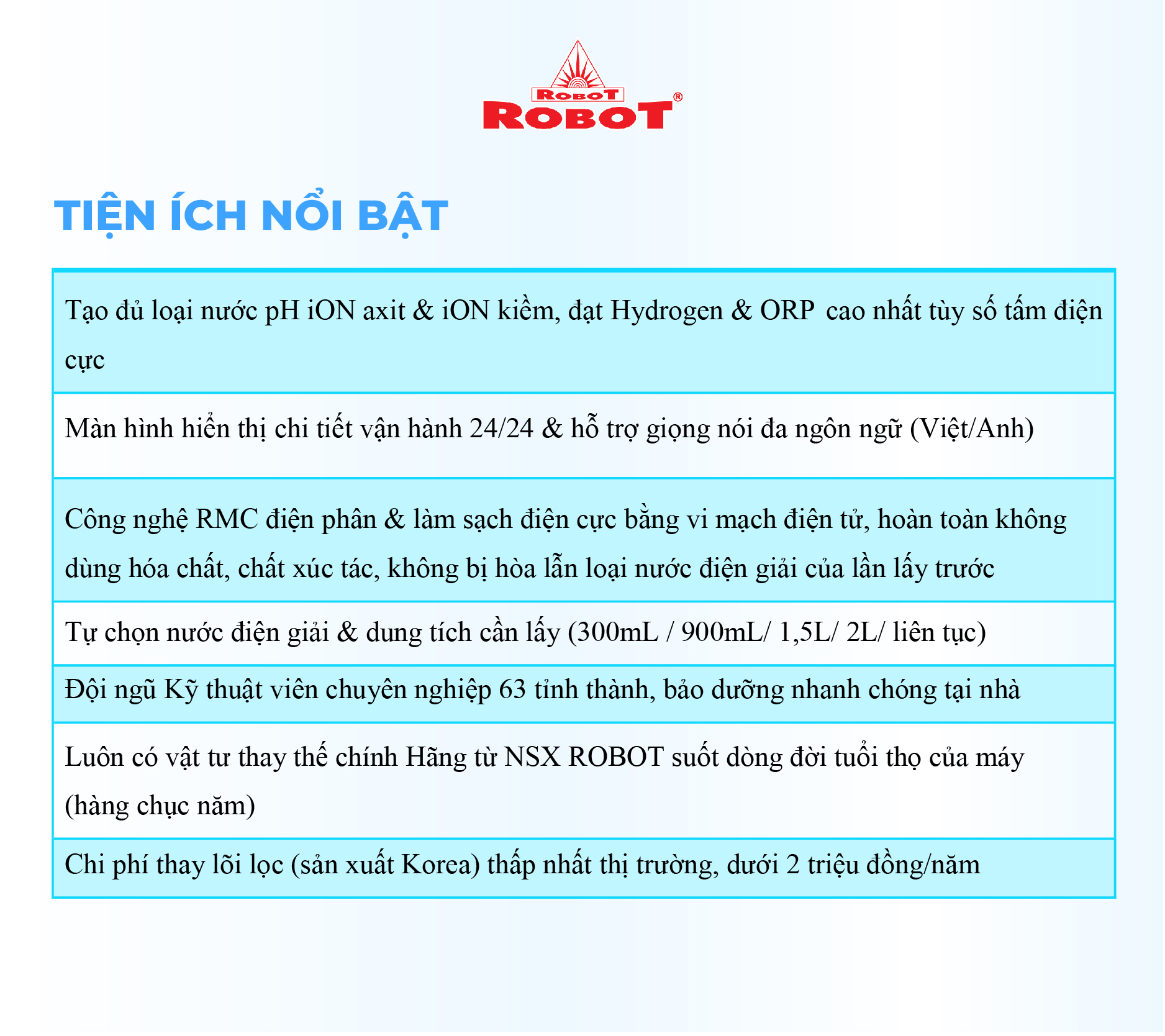 - Với mong muốn nhiều gia đình Việt có thể sử dụng nước điện giải iON kiềm với chi phí hợp lý để bảo vệ sức khỏe, sắc đẹp & nâng cao chất lượng cuộc sống, ROBOT mang đến sản phẩm “Chất lượng Quốc tế - Giá thành Việt Nam”, phù hợp với mức sống của nhiều người. Tiết kiệm cho người tiêu dùng đến hơn một nửa chí phí so với máy nhập khẩu chỉ từ 30 – 50%, nhưng sở hữu nhiều ưu điểm, tính năng vượt trội, chất lượng cao.