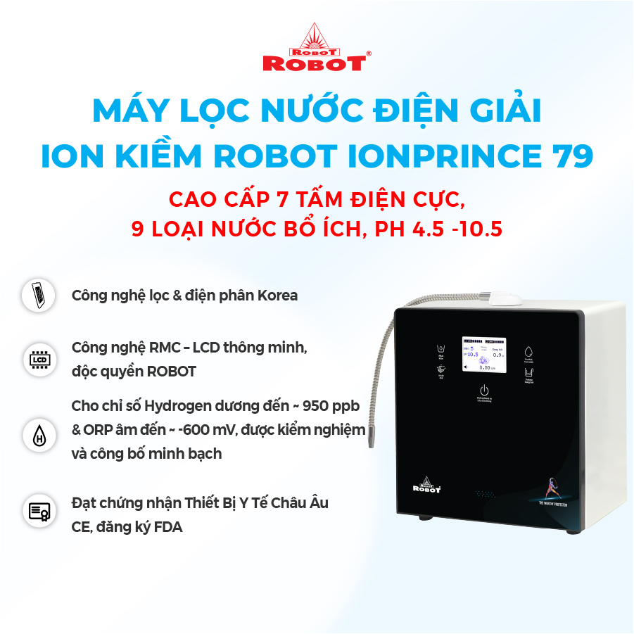 Mua tại TiktokMáy Lọc Nước Điện Giải Ion Kiềm ROBOT IonPrince 79 Máy lọc nước điện giải iON kiềm ROBOT ionPrince 79 là sản phẩm được sản xuất với công nghệ tiên tiến, cao cấp trang bị đến 7 tấm điện cực lớn nhất, có khả năng tạo ra đến 9 loại nước đa chức năng: