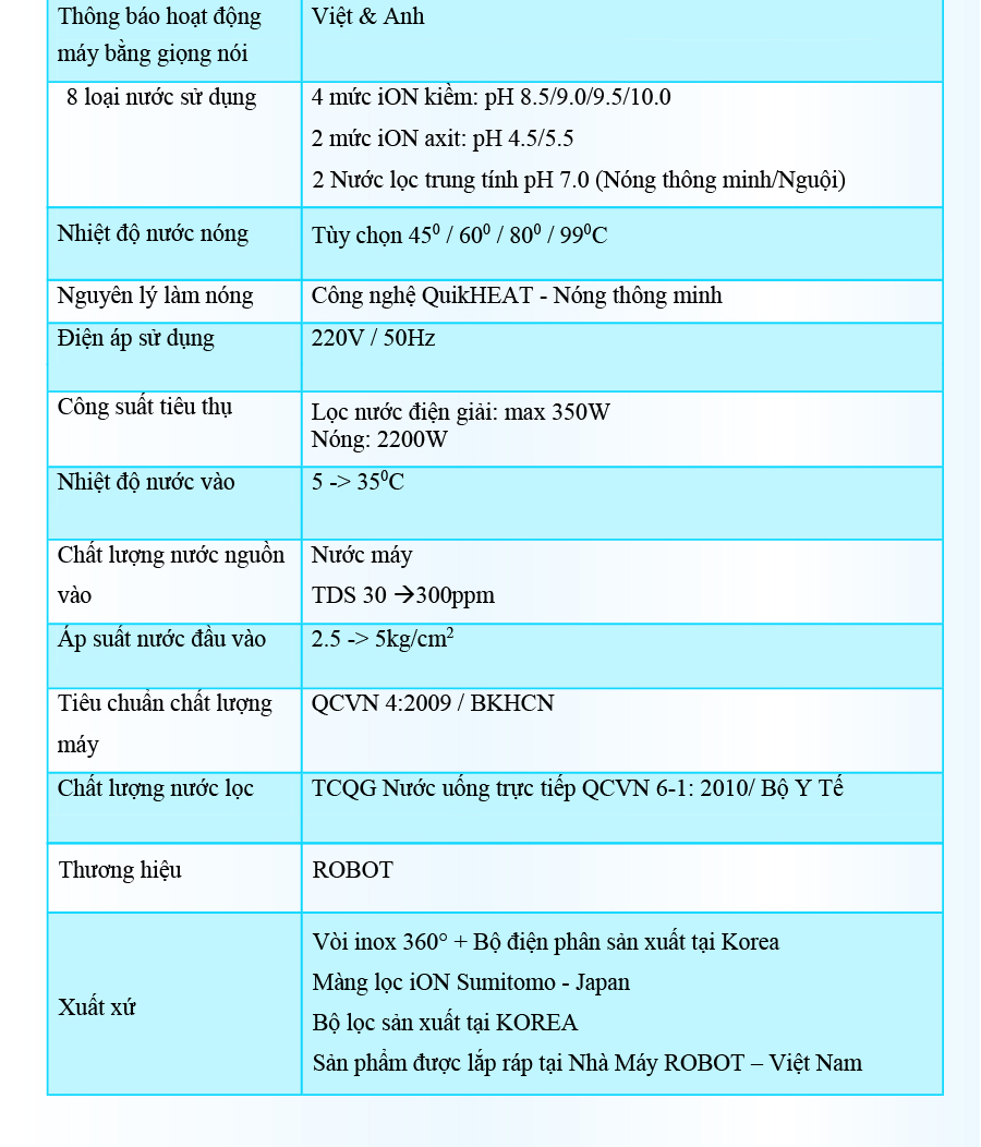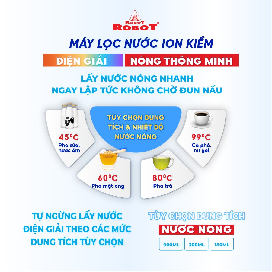 Với mong muốn nhiều gia đình Việt có thể sử dụng nước điện giải iON kiềm với chi phí hợp lý để bảo vệ sức khỏe, sắc đẹp & nâng cao chất lượng cuộc sống, ROBOT mang đến sản phẩm “Chất lượng Quốc tế - Giá thành Việt Nam”, phù hợp với mức sống của nhiều người. Tiết kiệm cho người tiêu dùng đến hơn một nửa chí phí so với máy nhập khẩu chỉ từ 30 – 50%, nhưng sở hữu nhiều ưu điểm, tính năng vượt trội, chất lượng cao.