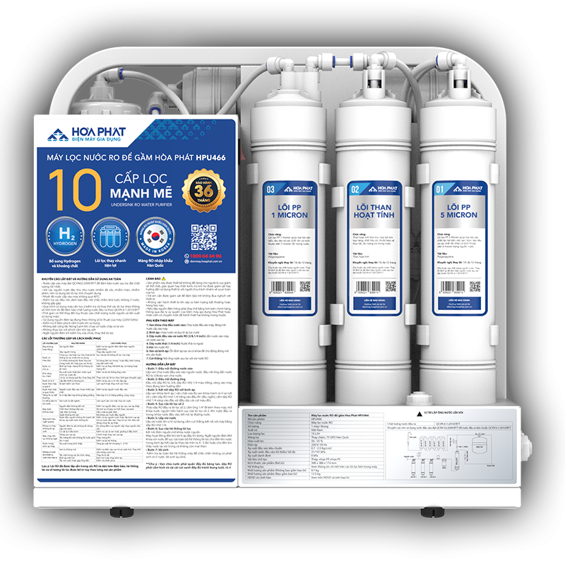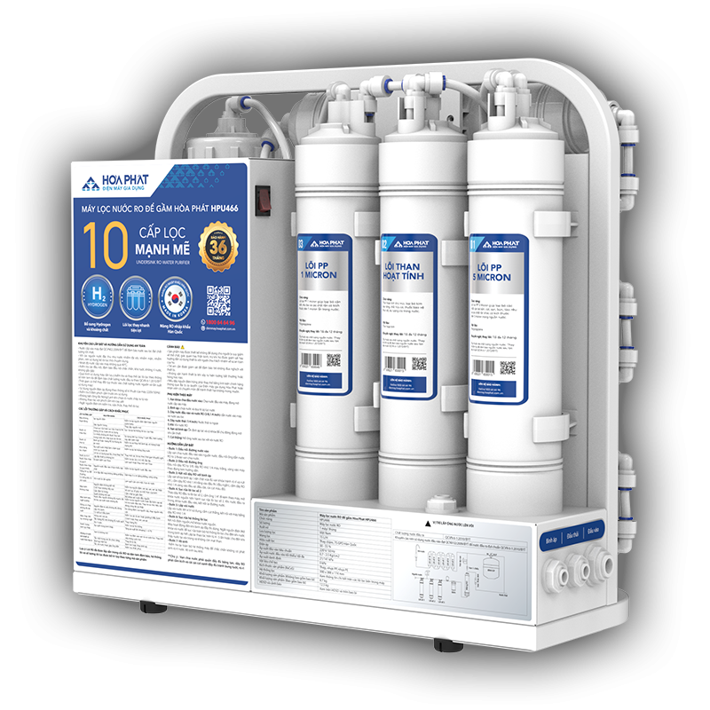 - Bảo hành vượt trội từng linh kiện lên tới 36 tháng. THÔNG SỐ KỸ THUẬT Thương hiệu:Hòa Phát Điện áp:220V/ 50Hz Công suất điện:35W Lưu lượng lọc:15L/ h Số cấp lọc:10 Màng lọc:RO 75 GPD từ Hàn Quốc Hệ thống lọc thô:3 cấp lọc thô (PP 5 micron, Than hoạt tính, PP 1 micron) Các lõi chức năng:6 lõi (T33 GAC, Maifan, Tourmaline, Far Infrared, Nano Silver, Hydrogen) Hiệu suất lọc:40 - 50 % (Điều kiện phòng LAB, nhiệt độ 25° C) Bơm:Lanshan LS-ZX-50E Áp suất tối thiểu, tối đa:10-125 psi (0,7 - 8,6 bar) Tiêu chuẩn áp dụng:TCVN 11978:2017 Chất lượng nước đầu ra:QCVN 6-1:2010/BYT Vật liệu: Thép, Nhựa PP, Nhựa PE… Kích thước sản phẩm:370x447x235 (mm) Xuất xứ:Việt Nam